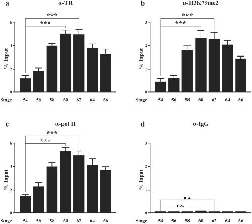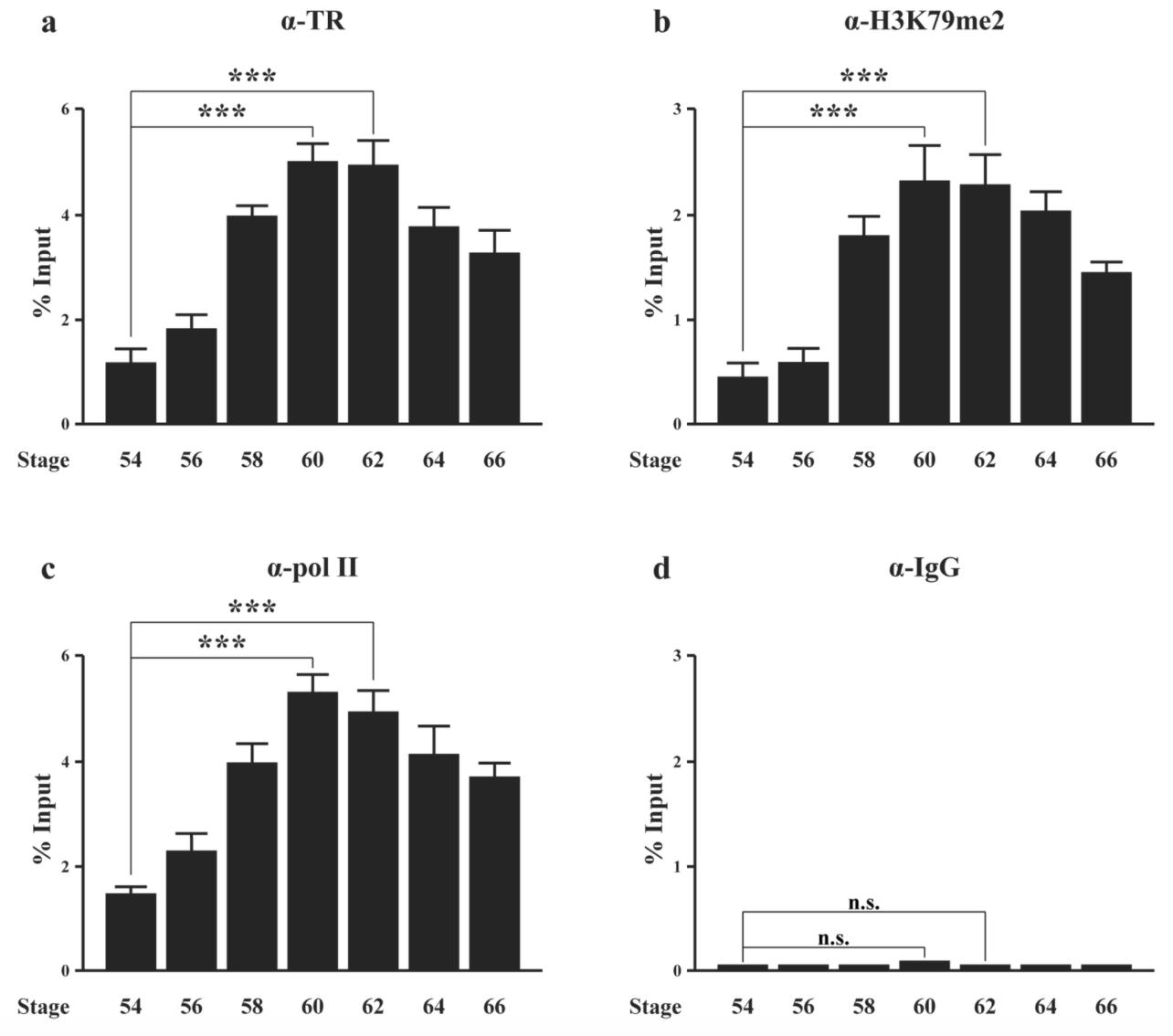 Fig. 5. Peak levels of TR binding at the climax of intestinal metamorphosis correlates with peak levels of RNA polymerase II recruitment and H3K79 methylation in the intestine during natural metamorphosis. ChIP assays were performed with indicated antibodies on the intestine of tadpoles at different metamorphic stages. a TR binding to the TRE region of Mettl1 gene at metamorphic climax stages (stage 60 and 62) is increased compared to that at premetamorphic stage 54. After climax, TR binding is reduced in TRE region of Mettl1 gene. b The level of dimethylated H3K79 in the TRE region of Mettl1 gene peaks in the intestine at metamorphic climax. c RNA polymerase II recruitment to the TRE region of Mettl1 promoter also peaks at metamorphic climax period. d Only background ChIP signal is detected with the negative control IgG ChIP throughout metamorphosis. n.s. not significant