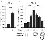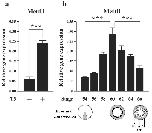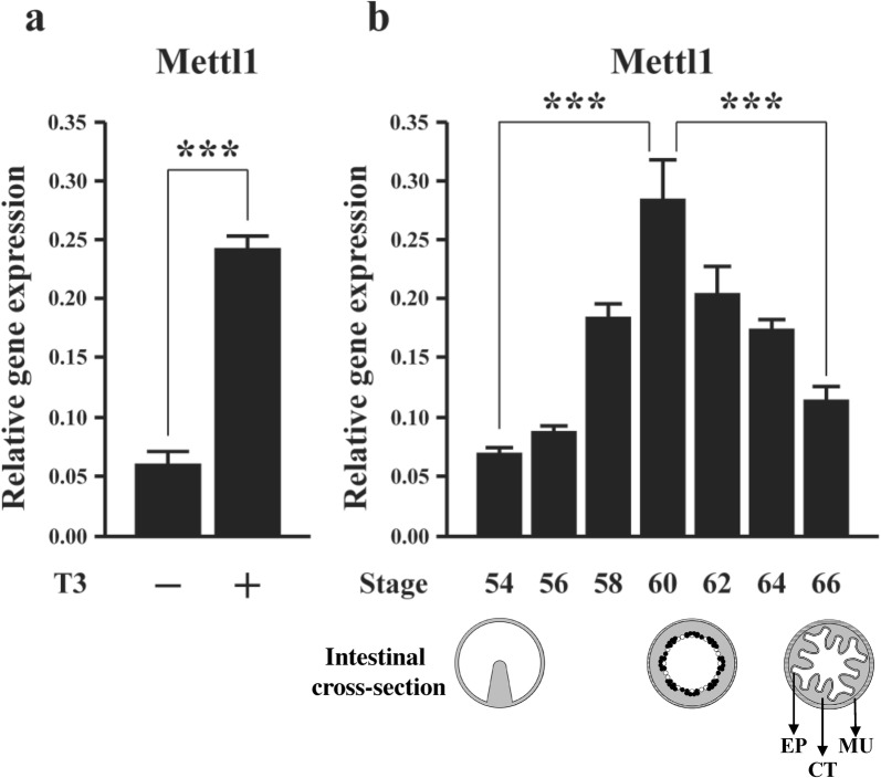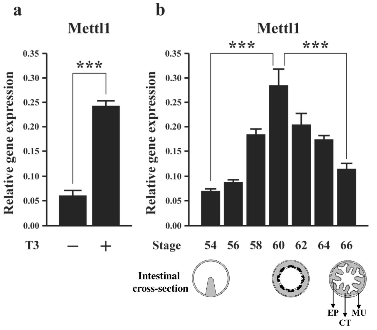Figure 1: Expression of Xenopus tropicalis Mettl1 increases during T3-induced and natural metamorphosis. a The expression of Mettl1 was analyzed during T3-induced metamorphosis. Stage 54 tadpoles were treated with 10 nM T3 for 2 days and total RNA was isolated from the intestine for RT-PCR analysis. b During natural metamorphosis, Mettl1 expression gradually increased from premetamorphic period to peak at the metamorphic climax. Total RNA was isolated from the intestine of tadpoles at indicated stages for RT-PCR analysis. Shown below the expression data are schematic diagrams of the intestine at different stages. In premetamorphic tadpoles at stage 54, the intestine is a simple structure with a single epithelial fold, the typhlosole, and thin layers of connective tissue and muscles. At the metamorphic climax around stage 61, the larval epithelial cells begin to undergo apoptosis, as indicated by the open circles. Concurrently, the proliferating adult stem cells are formed de novo via dedifferentiation of some larval epithelial cells, as indicated by black dots. By the end of metamorphosis at stage 66, the newly developed adult epithelium (EP) has multiple folds, surrounded by thick layers of connective tissue (CT) and muscles (MU). L: intestinal lumen. All data represent meanâ±âS.E.M. Significance value was ***Pââ¤â0.005