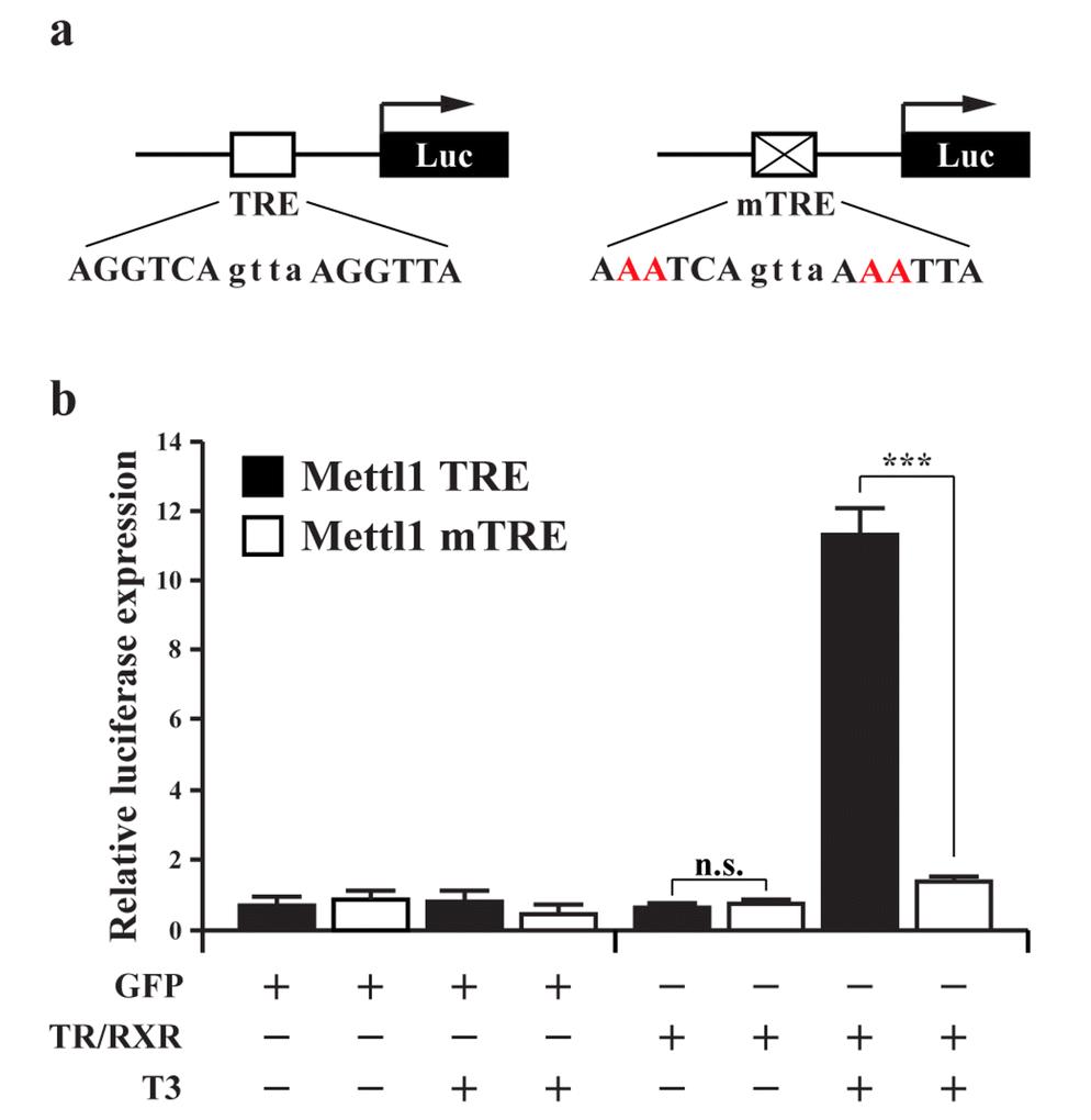 Figure 3: Liganded TR activates the Mettl1 promoter through the putative TRE. a Schematic diagrams of the Mettl1 promoter construct with the putative TRE of Mettl1 (Mettl1 TRE) or a mutant TRE (Mettl1 mTRE). The TRE sequence is shown below the TRE with the mutated residues shown in red. The Mettl1 TRE and Mettl1 mTRE fragments were cloned into pGL4.10 luciferase reporter vector. b The Mettl1 wild type but not the mutant promoter construct is activated by liganded TR in Xenopus laevis oocytes. The oocytes were injected with indicated mRNAs and reporter and harvested for luciferase assay. All data represent mean ± S.E.M. Significance value was ***P ≤ 0.005. n.s. not significant