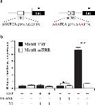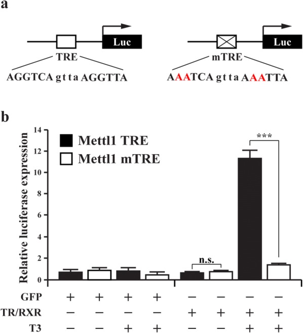 Fig. 3. Liganded TR activates the Mettl1 promoter through the putative TRE. a Schematic diagrams of the Mettl1 promoter construct with the putative TRE of Mettl1 (Mettl1 TRE) or a mutant TRE (Mettl1 mTRE). The TRE sequence is shown below the TRE with the mutated residues shown in red. The Mettl1 TRE and Mettl1 mTRE fragments were cloned into pGL4.10 luciferase reporter vector. b The Mettl1 wild type but not the mutant promoter construct is activated by liganded TR in Xenopus laevis oocytes. The oocytes were injected with indicated mRNAs and reporter and harvested for luciferase assay. All data represent mean ± S.E.M. Significance value was ***P ≤ 0.005. n.s. not significant