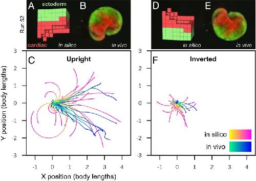 Fig. 4. Transferal from silico to vivo. The first design selected for fabrication and specific hypothesis testing (A) was the most robust yet stable and energy-efficient configuration of passive (epidermis; green) and contractile (cardiac; red) tissues found by the evolutionary algorithm. The design was evaluated 25 times for 1 min of simulation time, resulting in 25 movement trajectories (pink curves in C). Six reconfigurable organisms were built which embodied this design (e.g., B) (SI Appendix, section S9). Three were evaluated four times and the other three were evaluated five times for 10 min each (27 blue curves in C). The organismsâ direction of movement matched the designâs predicted direction of movement (P < 0.01; details in SI Appendix, section S9). To determine whether the organismsâ movement was a result of chance or due to the designâs evolved geometry and tissue placement, geometry and tissue distribution was altered by rotating the design 180° about its transverse plane (D) and evaluating it another 25 times in silico (pink curves in F). Each of the six organisms were likewise inverted (E): four were evaluated five times while the remaining two were only evaluated once (22 blue curves in F). Inverting the design significantly reduces its net displacement (P < 0.001), as did inverting the organisms (P < 0.0001).