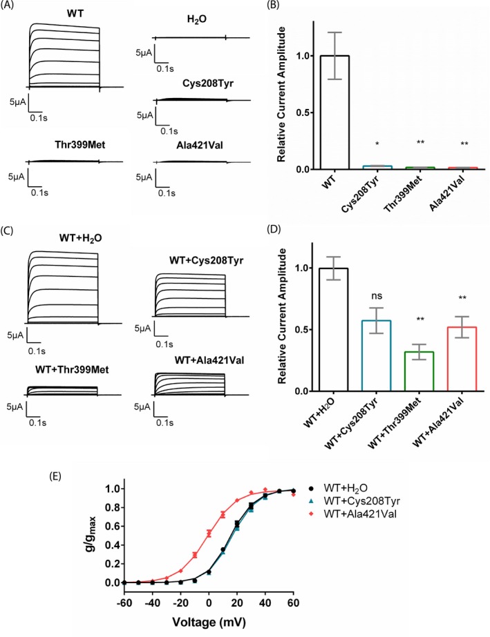 Figure 2. Functional consequences of the identified KCNC1 variants. (A) Representative traces of KV3.1 currents recorded in Xenopus laevis oocytes expressing the wild type (WT) and the singleâsite variants (Cys208Tyr, Thr399Met, Ala421Val) in response to the voltage steps from â 60 mV to + 60 mV. (B) Relative current amplitudes of oocytes injected with the WT (n = 23), Cys208Tyr (n = 8), Thr399Met (n = 14), and Ala421Val (n = 8) mutant channels (Dunnâs test, P < 0.05). Mean current amplitudes of currents elicited by a + 40 mV voltage step were analyzed between 0.4 and 0.5 msec and normalized to the mean value of WT channels recorded on the same day. (C) Representative current traces recorded in oocytes that were coinjected with WT cRNA and either water or a mutant cRNA in a 1:1 ratio. (D) Relative current amplitudes recorded from oocytes coexpressing WT and mutant channels (WT + H2O (n = 36), WT + Cys208Tyr (n = 8), WT + Thr399Met (n = 6), WT + Ala421Val (n = 27)) were normalized to the mean current amplitude of oocytes coinjected with the WT channel and water recorded on the same day (Dunn's test, P < 0.05). (E) Mean voltageâdependent activation of KV3.1 channel for WT (n = 20), WT + Cys208Tyr (n = 5) and WT + Ala421Val (n = 10) channels. Lines illustrate Boltzmann Function fit to the data points. The activation curve of WT + Ala421Val channels showed a significant shift to more hyperpolarized potentials in comparison to WT channels alone. All data are shown as means ± SEM. The following symbols were used for statistical differences: *