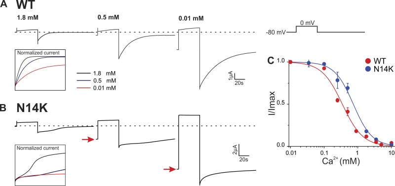 Figure 1. The NT mutation N14K decreases Ca2+ sensitivity and slows deactivation kinetics of Cx26 hemichannels. (A) Current traces elicited by a voltage pulse from â80 to 0 mV from oocytes expressing hCx26 WT hemichannels in the presence of the indicated Ca2+ concentrations. Normalized deactivation tail currents are shown in the inset for extracellular Ca2+ concentrations at 1.8 (black), 0.5 (blue), and 0.01 (red) mM. (B) Current traces elicited under the same conditions as A in oocyte expressing hCx26 N14K mutant hemichannels. Normalized deactivation tail currents are shown in the inset for identical Ca2+ concentrations as in A. (C) Ca2+ doseâresponse curve for oocytes expressing hCx26 WT (red) or hCx26 N14K (blue) determined from the peak tail currents after a voltage pulse from â80 to 0 mV. The solid line represents the best fit of the data to a Hill equation. The data points represent mean ± SEM (error bars) of at least five independent measurements.