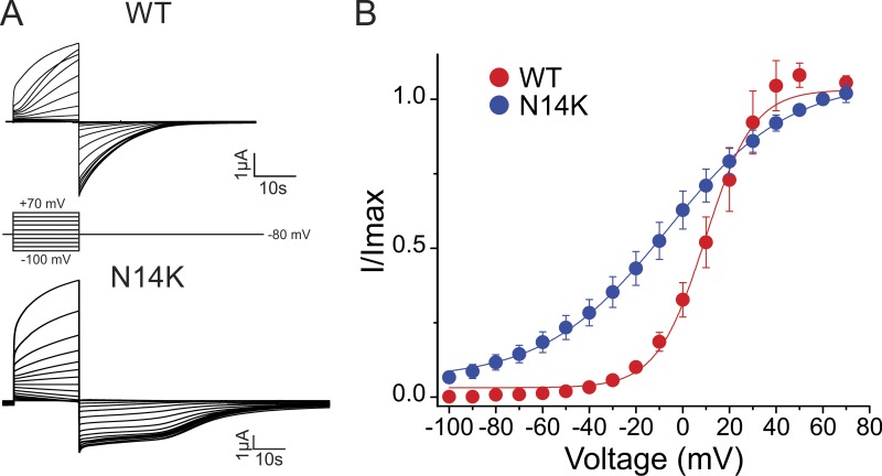 Figure 2. The N14K mutation causes channels to open at large negative voltages, unlike WT channels. (A) Representative hemichannel currents recorded from oocytes expressing hCx26 WT (top) and N14K mutant (bottom) protein obtained at 1.8 mM Ca2+. Cells were held at â80 mV, and voltage steps in 10-mV increments were applied for 20 s ranging from â100 to 70 mV. (B) Currentâvoltage relationship curves obtained from the peak tail currents for hCx26 WT (red) and mutant N14K (blue) hemichannels. The solid lines represent the best fit of the data to a Boltzmann equation. The data points represent mean ± SEM (error bars) of at least five independent measurements.