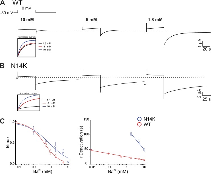 Figure 3. Deactivation kinetics in extracellular Ba2+ are significantly slower in N14K hemichannels compared with WT. (A) Current traces elicited by a voltage pulse from â80 to 0 mV from oocytes expressing hCx26 hemichannels in the indicated Ba2+ concentration. (B) Current traces elicited under the same conditions as A in oocytes expressing N14K mutant hemichannels. (C) Doseâresponse relation of hCx26 WT and N14K mutant for Ba2+ determined from the peak tail currents after voltage pulses from â80 to 0 mV. The solid line represents the best fit of the data to a Hill equation (left graph). Deactivation time constants as a function of Ba2+ concentrations (right graph). The solid lines correspond to linear fits to the data. The data points represent mean ± SEM (error bars) of at least three independent measurements.