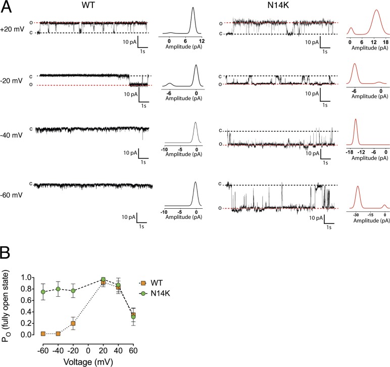 Figure 4. N14K mutant hemichannels display higher open probability than WT Cx26 hemichannels. Single-channel conductance and open probability were determined from data analysis of single-channel recordings performed in oocytes expressing WT Cx26 and N14K hemichannels. (A) Representative single-channel traces for a WT Cx26 or a N14K hemichannel obtained at 20, â20, â40, and â60 mV. The black dashed line indicates the closed state, and the red dashed line indicates the full open state (O). (B) Graph depicts the plot of the open probability (Po) at different voltages (mV) for WT Cx26 (squares) and N14K mutant (circles) hemichannels. The data points represent mean ± SEM (error bars); n = 10.
