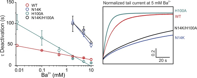 Figure 5. Double mutant N14K/H100A hemichannels have gating properties similar to N14K mutant hemichannels. (A) Deactivation time constants as a function of Ba2+ concentration obtained from the maximum peak tail current elicited after a depolarizing step from â80 to 0 mV for WT (red), N14K (blue), H100A (green), and N14K/H100A (black). The solid lines correspond to linear fits to the data. The data points represent mean ± SEM (error bars) of at least three independent measurements (left graph). Representative traces of deactivation currents for WT and mutants after a depolarizing step in presence of 5 mM Ba2+ (right panel). All traces were normalized to a value of 1, therefore the ordinate scale lacks units.