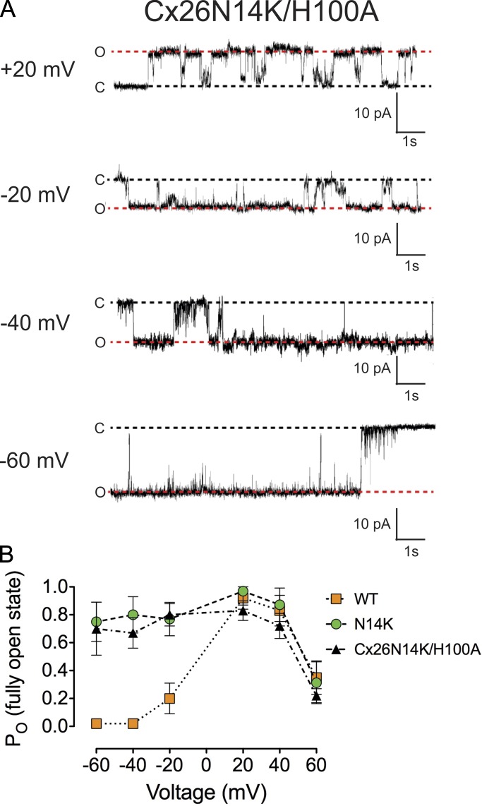 Figure 6. N14K mutant and N14K/H100A double mutant hemichannels display similar open channel probability. (A) Representative single channel for a N14K/H100A hemichannel obtained at 20, â20, â40, and â60 mV. (B) Graph depicts the plot of the open probability (Po) at different voltage (mV) for WT Cx26 (squares), Cx26N14K/H100A (triangles), and N14K mutant (circles) hemichannels. The data points represent mean ± SEM (error bars); n = 10.