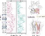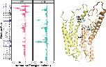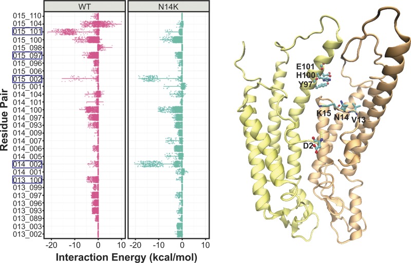 Figure 7. Pairwise GB energy interaction. The pairwise energy distribution of the 29 pairs with SD larger than 0.1 kcal/mol and P value <10â16 from the KS test. The top five pairs with the largest mean energy differences are marked by boxes. Two subunits from the Cx26 hemichannel structural model display residues at regions of interest. The raw data are provided in Table S1.
