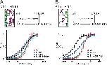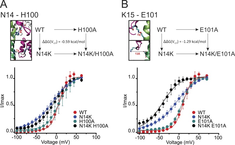 Figure 8. Mutant cycle analysis indicates that NT residues are thermodynamically coupled with adjacent residues at the TM2/CL border. (A) Scheme for mutant cycle analysis of WT and mutant hemichannels and image showing the distance between N14 and H100 in the WT channel (top). Graph shows the voltage dependence for oocytes expressing hCx26 WT (red), N14K (blue), and H100A (green) mutants and N14K/H100A (black) double mutant hemichannels. The solid lines represent the best fit of the data to a Boltzmann equation. (B) Same representations as A for mutants N14K, E101A, and N14K/E101A. The data points represent mean ± SEM (error bars) of at least five independent measurements.