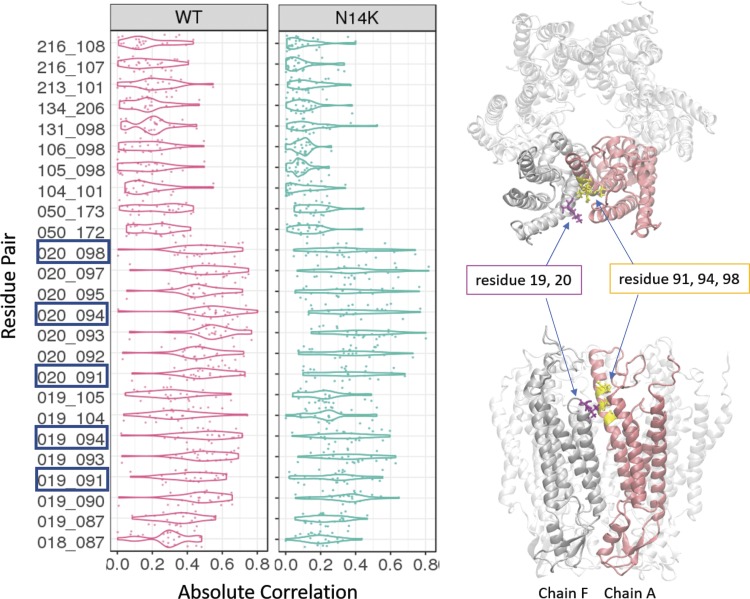 Figure 9. Correlation analysis (Cij) of α carbon motion. The pairwise absolute correlation distribution of 25 pairs with P < 0.005 from the KS test between WT and N14K mutant. Statistical details: Because there are 226 residues in each subunit, the total number of unique residue pairs between neighboring subunits are 226 ⋅ 226 = 51,076. As for the pairwise interaction analysis (Fig. 7), we first pulled the data from all systems, all replicas, and all six subunits together. We then filtered out the α carbon pairs between neighboring subunits that had either mean absolute Pearson correlation value <0.1 in both systems or the SD of absolute correlation value ≤0.1. Next, 8,389 of 51,076 pairs were subjected to the KS test between WT and N14K mutant using data from all replicas and all subunits. The absolute correlation value distribution of all 25 pairs that had P value <0.005 from the KS test are shown in the figure. The top five pairs that showed the largest change in mean difference in correlation are highlighted in boxes and shown on the protein structure. The raw data are provided in Table S2.