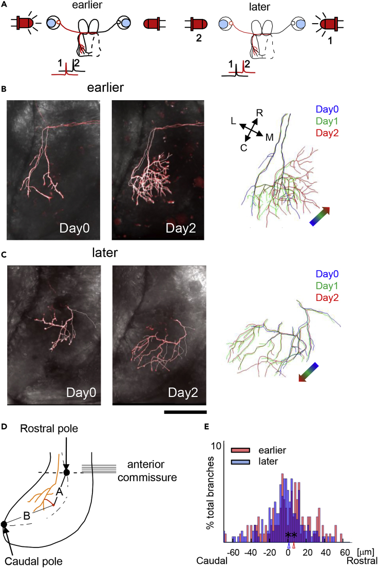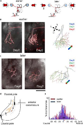 Figure 1. The Temporal Sequence of Afferent Activity Is Transformed into the Spatial Order of Axon Projections(A) Experimental design to assay the transformation of the temporal sequence of stimulation into a spatial representation of sequential axon activity. One tectal lobe is ablated so that the RGC axons from both eyes project to the remaining tectum. By stimulating the eyes sequentially with LEDs, the two groups of the convergent RGC axons are activated in a sequence. RGCs in the left eye are sparsely labeled with tdTomato (red) for in vivo time-lapse imaging of dynamic changes in axon arbor morphology and analysis of changes in branch tip positions. The sequence of activity is schematized under each panel. Left panel: The left eye with the labeled axons is stimulated 15 ms earlier (dt = â15ms) than the right eye. Right panel: The left eye is stimulated 15 ms later (dt = +15ms) than the right eye. The animals are raised in dark until the stimulation protocol begins. The eyes are stimulated for 10 h per day starting after the images were collected on Day 0.(B and C) Examples of the directional axon morphology branch tip shift with opposite temporal sequences of retinal activity. The left eye was stimulated 15 ms earlier or later than the right eye, as schematized in (A), for earlier or later stimulation of the eye with the labeled axons, respectively. Left: Time-lapse confocal images of z series through axons imaged before and 2 days after the stimulus protocol, superimposed on differential interference contrast images of the tectum. Right: Axon reconstructions from images collected on Day 0 (blue), Day 1 (green), and Day 2 (red) are superimposed. The colored arrow shows the overall direction of branch shift over the 3 days of imaging. The rostrocaudal (R<->C) and mediolateral (M<->L) orientation of the tectum is shown in the inset. (B and C) show 2 and 1 axons, respectively.(D) Quantification of branch tip movement. The relative distance from each axon branch tip (A) to the rostral and the caudal poles (B) was measured for each time point. Changes in the relative positions between time points were determined and expressed as a shift toward the rostral or caudal pole.(E) Histogram of the proportion of total branch tips that shift toward the rostral or caudal poles for axons stimulated earlier (red) or later (blue), where 0 indicates no shift. Bin = 1.5 μm. Bootstrap (N = 10,000) was used to determine the significance (p = 0.0013) of the difference in the mean values.Scale bar, 100 μm in (B, C: left) and 67 μm in (B, C: right). N = 144 and 219 branches in 7 and 7 animals for earlier and later conditions, respectively. |