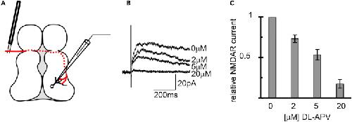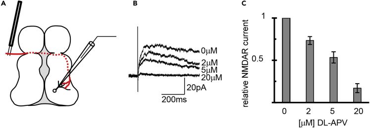 Figure 2. APV Dose-Dependent Block of NMDAR(A) Schematic of experiment: NMDAR currents in response to stimulating RGC axons (red) in the optic tract were recorded in whole-cell mode from tectal cells held at +40 mV holding potential in the presence of 20 μM NBQX and 100 μM picrotoxin.(B) Averages of 20 traces of NMDAR-mediated excitatory postsynaptic currents recorded in the presence of increasing concentrations of DL-APV added to the bath.(C) Relative total charge transfer normalized to 0 μM APV. 0 μM: 100%, 2 μM: 73.4% ± 10.4%, 5 μM: 53.4% ± 11.5%, 20 μM: 17.0% ± 7.5%. N = 5. |