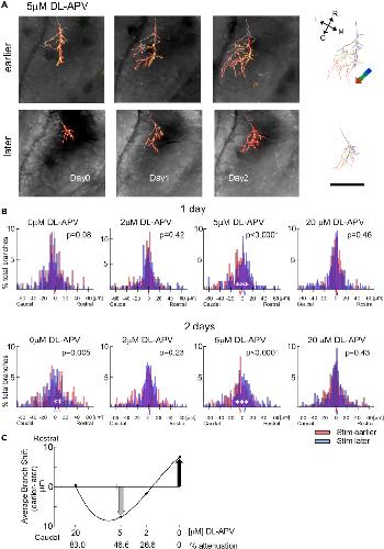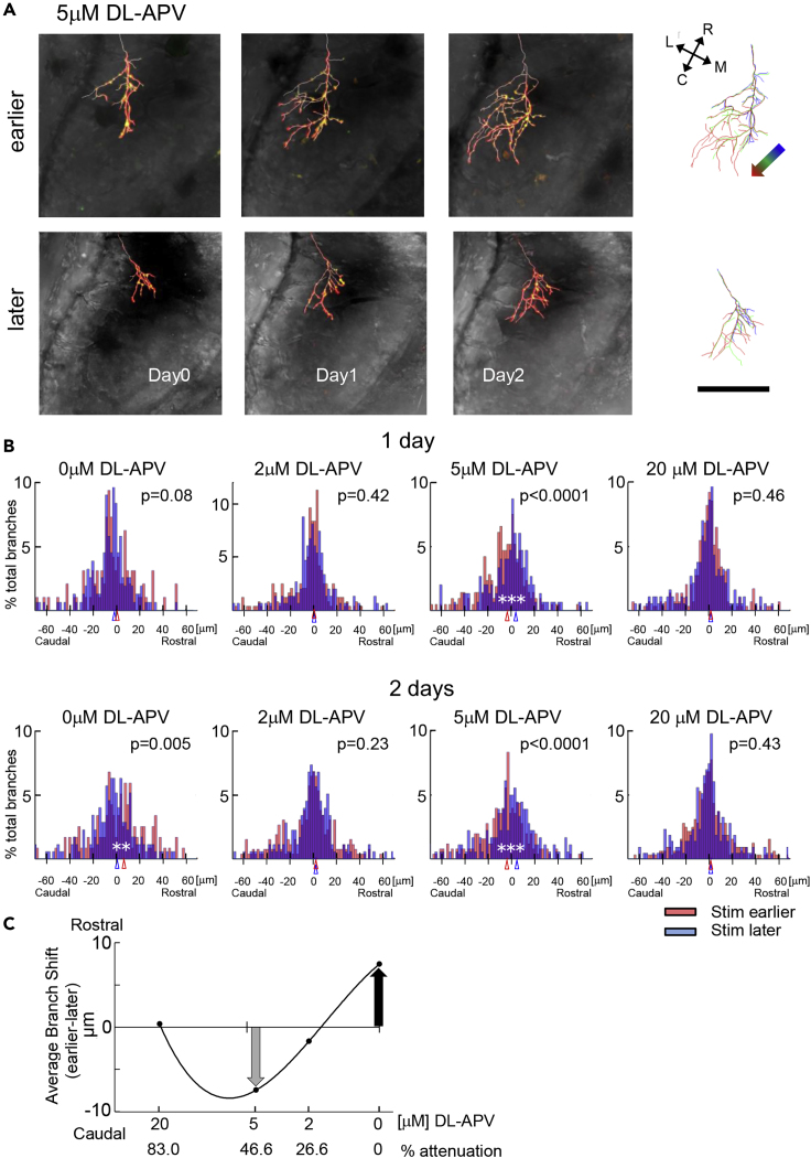 Figure 3. Attenuation of NMDAR Activity Flips the Direction of Axon Branch Growth Induced by Sequential Afferent Activity(A) Examples of effect of 5 μM APV on directional axon morphology branch shift when left and right eyes were stimulated in sequence, as in Figure 1A. Single axons in the eye ipsilateral to the tectum were labeled. The labels âearlierâ and âlaterâ refer to the ±15-ms offset in stimulation sequence of the imaged axons. Stimulation started after imaging at âday 0,â marked under the panel. Left: Time-lapse confocal images of z series through axons imaged before (day 0) and 1 and 2 days after the stimulus protocol, superimposed on differential interference contrast images of the tectum. Right: Axon reconstructions from images collected on Days 0 (blue), 1 (green), and 2 (red) are superimposed. The colored arrow in the upper row shows the overall direction of branch shift over the 3 days of imaging. The orientation of the tectum is shown in the inset. Data from other APV concentrations are shown in Figure S2.(B) Quantification of branch shift along the rostrocaudal axis (from Figure 1E). Histograms of the amplitudes of branch tip movement toward the rostral or caudal tectal poles for axons stimulated earlier (red) or later (blue). Bin = 1.5 μm. Bootstrap (N = 10,000) was used for statistics. p values are shown in the figure. N = 99 and 256 branches in 5 and 8 animals for earlier and later conditions, respectively.(C) Relationship between the relative NMDAR activity and the average relative branch tip shift. Scale bar, 100 μm in (A). The shift of the later group is subtracted from that of the earlier group. |