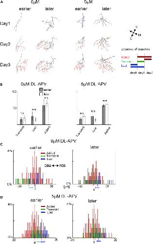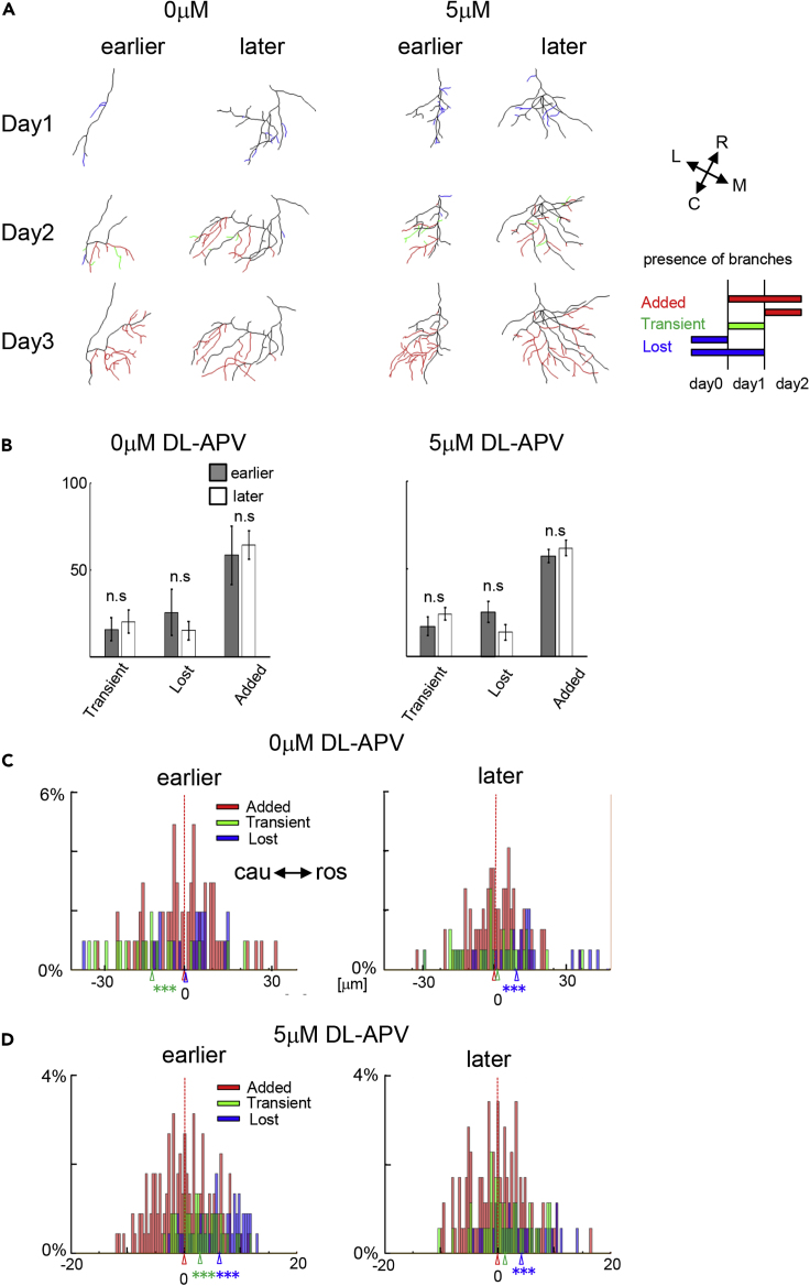 Figure 4. Graded NMDAR Function Alters the Spatial Distribution of Dynamic and Stable Branches(A) Representations of branch dynamics in axon arbors over 3 days (days 0, 1, 2) from earlier- or later-stimulated conditions in animals exposed to 0 μM APV or 5 μM DL-APV during the visual stimulation protocol. Reconstructions of axon arbors over 3 days show dynamic branches based on their presence at each time point. Branches are categorized and color coded according to the schematic shown in the lower right of the panel. Added branches, red; transient branches, green; lost branches, blue. The orientation of the arbors in the tectum is shown by the inset in the upper right panel.(B) The proportion of transient, lost, and added branches in axons from earlier- and later-stimulated conditions from animals exposed to 0 μM APV (left) or 5 μM DL-APV (right) was not significantly different.(C and D) Histograms of the spatial distribution of the branches along the rostrocaudal axis of the tectum in 0 and 5 μM DL-APV for the different dynamic branch categories: added (red), transient (green), lost (blue). x axis represents the locations of the branch tips along the rostrocaudal tectal axis, normalized to the distribution of added branch tips, with the median set as 0. âââp < 0.001, Bootstrap test N = 10,000. |