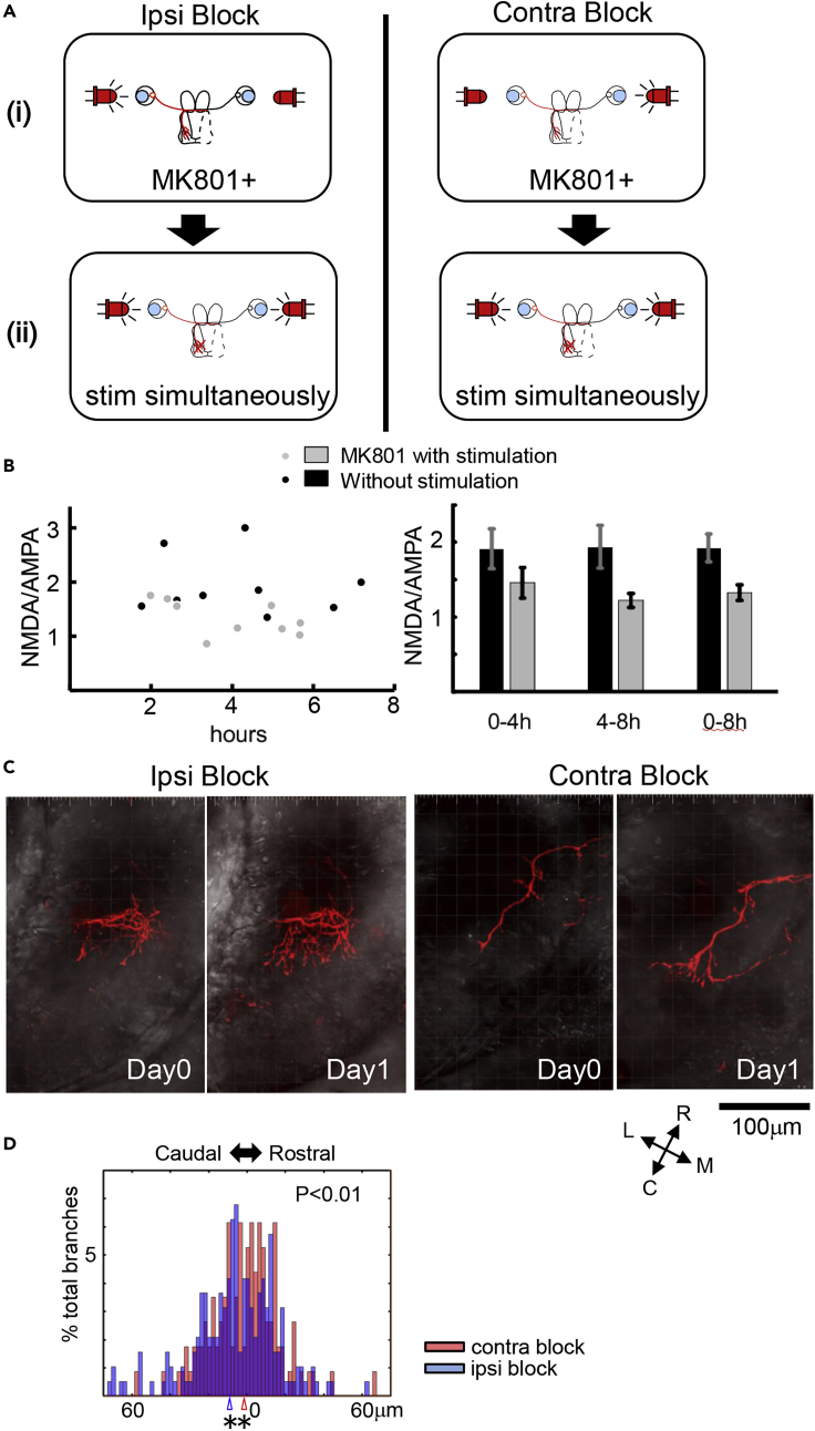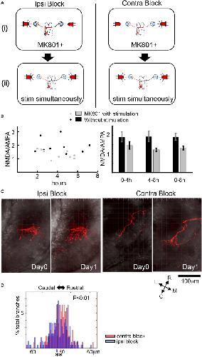 Figure 6. Asymmetric NMDAR Activity between Two Convergent Inputs Redirects Branch Growth(A) Schematic of the experimental design. Top: Animals with a dually innervated optic tectum and single labeled retinotectal axons were used. NMDAR activity in one retinal pathway, ipsilateral or contralateral to the tectum with the labeled axon, was attenuated by stimulating the eye with flickering LED in the presence of 2 μM MK801 for 15 min (IPSI Block and CONTRA Block, respectively). To prevent the activation of the other eye by the flicker, the other side was illuminated with constant light from the LED. Bottom: After washing out MK801, both eyes were stimulated simultaneously and branch dynamics were quantified using in vivo time-lapse imaging.(B) Left: Plot of NMDAR current normalized to AMPAR current recorded at specified times after MK801 treatment. Right: Plot of average NMDAR/AMPAR current ratios binned over time.(C) In vivo time-lapse confocal z series images of axon arbors imaged on Day 0 and Day 1 in animals under IPSI Block and CONTRA Block conditions superimposed on differential interference contrast images of the tectum.(D) Histograms of the amplitudes of branch tip movement toward the rostral or caudal tectal poles for axons imaged under IPSI (blue) and CONTRA (red) Block conditions. Bin = 2 μm. Bootstrap (N = 10,000) was used for statistics. ââp < 0.01. (N (IPSI) = 144 branches in 6 axons, N (CONT) = 237 branches in 6 axons. |
