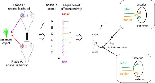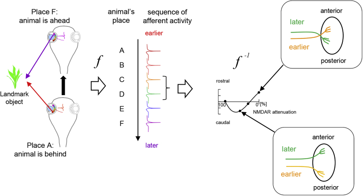 Figure 7. Schematic Model of the Role of NMDAR in Circuit PatterningAs an animal moves past a landmark object, from position A, behind the landmark, to position F, in front of the landmark, RGCs from temporal to nasal positions are sequentially activated (left). Consequently, as the animal moves from position A to F, information about the landmark object in the RGCs' receptive fields is transcribed into the temporal sequence of the RGC activity (middle). This sequential activity pattern in retinotectal afferents is transformed into a visuotopic spatial map (fâ1, right, top), but the temporal to spatial transformation is inverted when NMDAR signaling is decreased (right, bottom). |