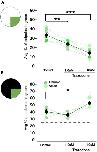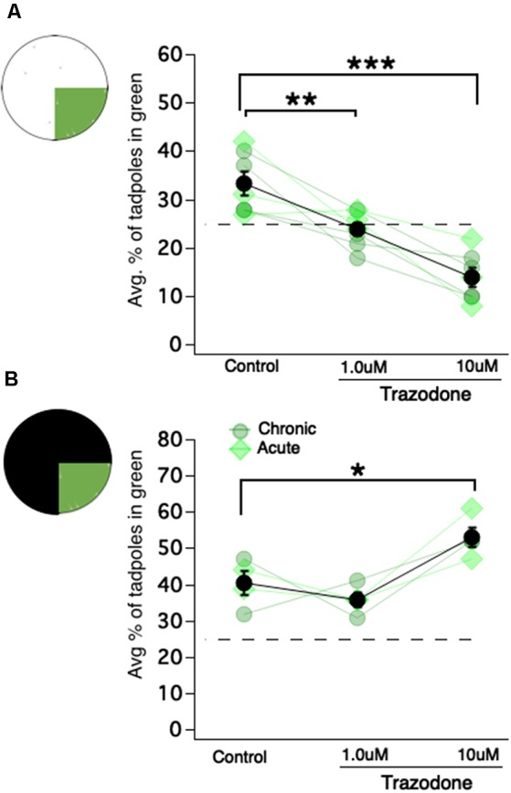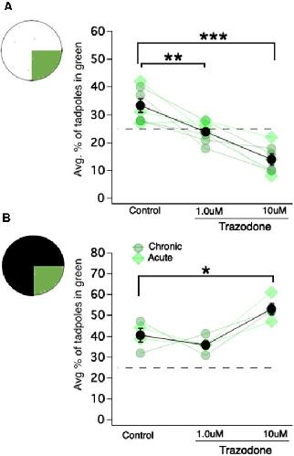 Figure 4. Exposing Xenopus tadpoles to the selective serotonin reuptake inhibitor (SSRI) trazodone switches the preference for the green region of the dish to the brightest region of the dish, regardless of color. (A) A schematic of the green vs. white test and corresponding dot plot showing the average percentage of tadpoles in the green region as a function of trazodone concentration (**p < 0.01, ***p < 0.001). Each connected set of symbols represents the average values for a given clutch. The overall average (shown in black) represents the data obtained from seven different clutches of tadpoles. Acute exposure to trazodone (light green diamonds) and chronic exposure (gray-ish green circles) appeared to elicit the same effect. (B) Four of the seven clutches tested in the green vs. white test (shown in panel A) were also tested in the green vs. black test (*p < 0.05). These data are also displayed as a dot plot showing the average percentage of tadpoles in the green region as a function of trazodone concentration.