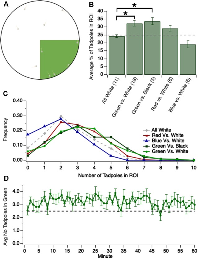 Figure 1. Tadpoles spend significantly more time in the green region of test dish when green is pitted against either white (brighter than green) or black (darker than green). (A) Experimental design: 1/4th of the floor of the test dish, the region of interest (ROI), is colored either green (shown here), blue, or red. The colors are approximately equiluminant. Ten tadpoles are transferred into the dish and videotaped for either 1 h or 30 min as they swim freely around the dish, and videos are analyzed off-line. (B) Bar graph showing the average number of tadpoles residing for different colored ROIs, pitted against black or white (*p < 0.05). The dashed line represents the percentage of tadpoles expected to be in the ROI if no preference. (C) Normalized frequency (Y-axis) of observing a given number of tadpoles in a given ROI (X-axis). (D) Plot showing the average number of tadpoles (out of 10 total) in the green quadrant at each minute, across 60 min. Notice that the average strength of preference for the green quadrant is modest yet stable over time, and is established by minute 2 of the trial. The trace/function represents 18 trials. The dashed line represents the average number of tadpoles expected to be in the green quadrant, at any given point in time, if no preference.