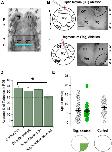 Figure 3. Ablation studies indicate that the preference for the green region of the dish requires the tegmentum but not the OT. (A) Overhead view of stage 48 tadpolebrain. OT (region inside black square) is a major component of the amphibian midbrain; the blue horizontal line indicates the approximate position along the rostrocaudal axis at which the OT is most extensive. The tegmentum resides directly ventral to this region of the OT, and so is not visible in this image. OB, olfactory bulb; OT, optic tectum; R, rostral; C, caudal. (B, schematic) Cross-section of this region. The dorsal optic tectum and ventraltegmentum are separated in space by the large MV. For optic tectum ablations, the pipette is advanced at an oblique angle to ablate specifically the OT; (B, micrograph) cross-section showing an ablated tectal lobe. D, Dorsal; MV, Middle Ventricle; TSC, torus semicircularis; Teg, Tegmentum. (C, schematic) Cross-section showing that for tegmentum ablations, the pipette is advanced at a steeper angle. (C, micrograph) Cross-section showing an ablated tegmentum. The dashed-line-enclosed regions are the regions that have been ablated. Here, only one hemisphere is ablated to readily compare ânormalâ and âablatedâ structures. For the experiments, both hemispheres are ablated. Red vertical lines on the schematics indicate the midline. Scale bar = 100 μm for both images. (D) Bar graph summarizing the effects of dark-rearing, tectal ablation, and tegmental ablation (*p < 0.05). Only the tegmental-ablated show a significant loss in preference for green compared to controls. (E) Dot plots showing swimming speeds of tegmentum-ablated tadpoles while in the white and green region of the test dish, and speeds of control tadpoles in an all-white dish. Each dot represents an individual tadpoleâs swimming speed. Notice that average swimming speeds for tegmental-ablated tadpoles are similar across the green and white test dish, and are also similar to swimming speeds of control tadpoles in an all-white dish.