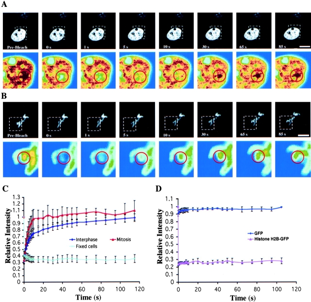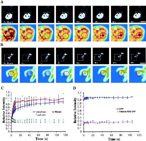 Figure 2. FRAP. (A) Selected images of an interphase cell during FRAP of an area in the nucleus (red circle). Bottom panels show the enlargement of the indicated area (white dashed square) in pseudocolor. (B) Selected images of a mitotic cell during FRAP of an area on the chromosome. Bar, 10 μm. (C) RCC1-GFP FRAP kinetics in the interphase nucleus, on condensed chromosomes, and in the nuclei of methanol-fixed cells. (D) GFP and histone H2B-GFP FRAP kinetics in the interphase nucleus. Values in C and D represent means ± SD from at least five different cells.
