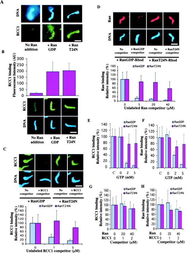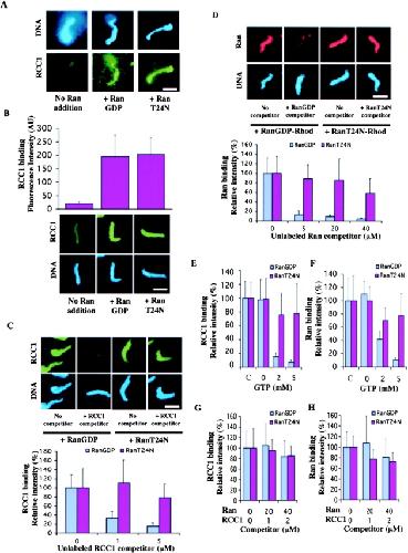 Figure 5. Biochemical characterization of the binding of Ran and RCC1 to the chromosomes. (A) Both RanGDP and RanT24N strongly stimulate the binding of the endogenous RCC1 in the egg extract to the mitotic chromosomes assembled from the sperm chromatin. The binding of the endogenous RCC1 to the chromatin is detected by immunofluorescence using an anti-RCC1 antibody. (B) RCC1-GFP and sperm was added to the egg extract supplemented with purified RanGDP or RanT24N. The fluorescence intensity of RCC1-GFP on the sperm chromatin was quantified as arbitrary unit (AU). (C) RCC1 competition. The sperm was incubated with egg extracts supplemented with RCC1-GFP and either RanGDP or RanT24N in the presence of unlabeled RCC1 at the indicated concentrations. The amount of RCC1-GFP bound to the chromatin was quantified. (D) Ran competition. Sperm was incubated with egg extracts containing Rh-RanGDP or Rh-RanT24N and unlabeled RanGDP or RanT24N at the indicated concentrations, respectively. The amount of labeled Ran bound to the chromatin was quantified. (E and F) Buffer containing 0–5 mM GTP was incubated with sperm chromatin with bound Rh-Ran or RCC1-GFP on coverslips for 20 min. The amount of labeled proteins on the sperm chromatin was quantified either before (c, control) or after incubation. (G and H) The same sperm chromatin as in E and F were incubated with buffer containing indicated concentrations of unlabeled Ran and RCC1 as competitors in the absence of free GTP. The amount of chromatin-bound RCC1-GFP (G) or Rh-Ran (H) was quantified after incubation. Error bars represent SD.