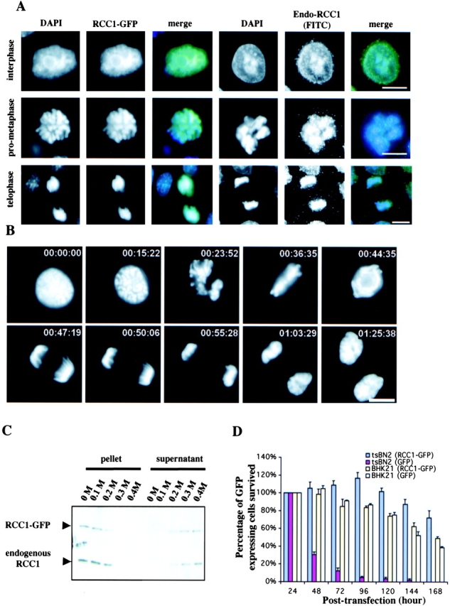 Figure 1. Characterization of RCC1-GFP. (A) RCC1-GFP–expressing or –nonexpressing Swiss 3T3 cells were fixed and stained with DAPI to visualize DNA. The nonexpressing cells were also stained with anti-RCC1 antibody to visualize endogenous RCC1. Both RCC1-GFP and endogenous RCC1 colocalized with DAPI in interphase and mitosis. Bar, 10 μm. (B) Time-lapse microscopy of RCC1-GFP–expressing cells during mitosis. Bar, 10 μm. (C) RCC1-GFP and endogenous RCC1 were extracted from isolated nuclei with increasing concentrations of salt and analyzed by Western blotting. (D) Plasmids expressing RCC1-GFP or GFP were transfected into tsBN2 cells, which harbor a temperature-sensitive mutation in RCC1, and the wild-type parental cells, BHK-21. The cells expressing RCC1-GFP or GFP were counted in five random fields with a 20× objective 24 h after transfection. Cells were then shifted to the nonpermissive temperature (39.5°C) to inactivate endogenous RCC1 in tsBN2 cells and were counted every 24 h. The tsBN2 cells transfected with GFP did not survive at the nonpermissive temperature. The same cells transfected with RCC1-GFP, and the control BHK-21 cells survived, leading to establishment of stable cell lines able to grow at 39.5°C.