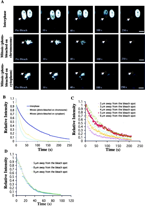 Figure 3. FLIP. (A) Selected images of interphase or mitotic cells during FLIP of the indicated area (yellow circles). Bars, 10 μm. (B) Kinetics of overall RCC1-GFP FLIP in interphase and mitotic cells. (C and D) Kinetics of RCC1-GFP FLIP in interphase (C) and mitotic (D) cells.