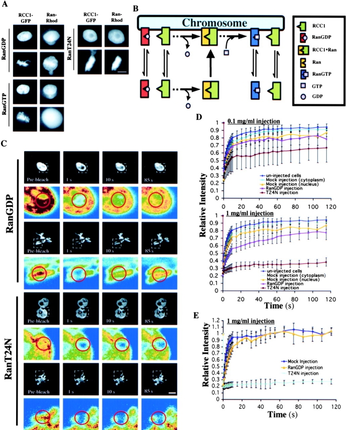 Figure 4. The binary complex of Ran–RCC1 binds stably to the chromatin in vivo. (A) Rh-RanGDP, Rh-RanT24N, or Rh-RanGTP was injected into interphase nuclei or mitotic cytoplasm of RCC1-GFP–expressing cells, followed by live imaging using fluorescence microscopy. Bar, 10 μm. (B) The model. RCC1, RanGDP, and RanGTP interact with the chromatin reversibly due to low affinity binding, whereas the RCC1–Ran binary complex binds to the chromatin stably. The ternary complexes of RCC1–Ran–GDP (or GTP) are omitted from the drawing for simplicity. (C) RanGDP or RanT24N was injected into the interphase nuclei or mitotic cytosol at 1 mg/ml followed by FRAP analysis of RCC1-GFP. Selected images before and after the bleach pulses (red circle denotes the bleached spot) were shown. Colored panels show the enlargement of the indicated area (white dashed square) in pseudocolor. Bar, 10 μm. (D) FRAP kinetics of injected interphase cells. Values represent means ± SD from at least five cells. (E) FRAP kinetics of injected mitotic cells. Values represent means ± SD from at least three cells and five independent FRAPs.