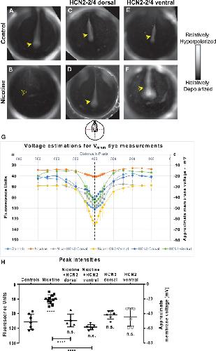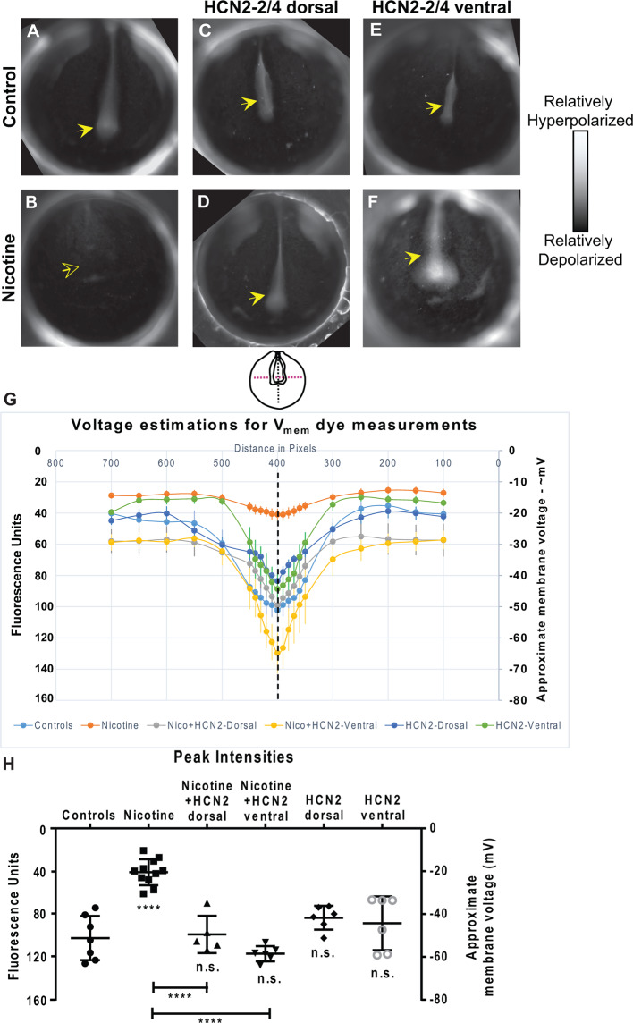 Figure 4. Both local (CNS) and distant (non-CNS) expression of HCN2 channels restore neural developmental membrane voltage prepatterns in nicotine-exposed embryos. (AâF) Representative CC2-DMPE membrane voltage reporter dye images of stage ~15 Xenopus embryos: Control (untreated and uninjected) or nicotine-treated embryos with or without microinjection with Hcn2-WT mRNA either in dorsal or ventral blastomeres at the four-cell stage. Solid yellow arrows indicate characteristic hyperpolarization in the neural plate as previously reported (Pai et al., 2015b, 2018). Hollow yellow arrows indicate significantly reduced signal (depolarization) within the neural plate in comparison to controls. (G,H) Quantification of fluorescence from CC2-DMPE images of stage 15 Xenopus embryos along with electrophysiology-based membrane voltage approximations [as previously reported in refs (Pai et al., 2015b, 2018)] for the indicated conditions. (G) Quantification obtained along the magenta dotted line indicated in the illustration. (H) Quantification at the point of intersection of the magenta and black dotted line indicated in the illustration. Data represented as mean ± SD, ****p < 0.0001. n.s.: non-significant (one-way ANOVA with Tukeyâs post hoc test for N > 5 embryos for each treatment group at each point of the indicated spatial distance). |