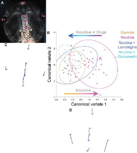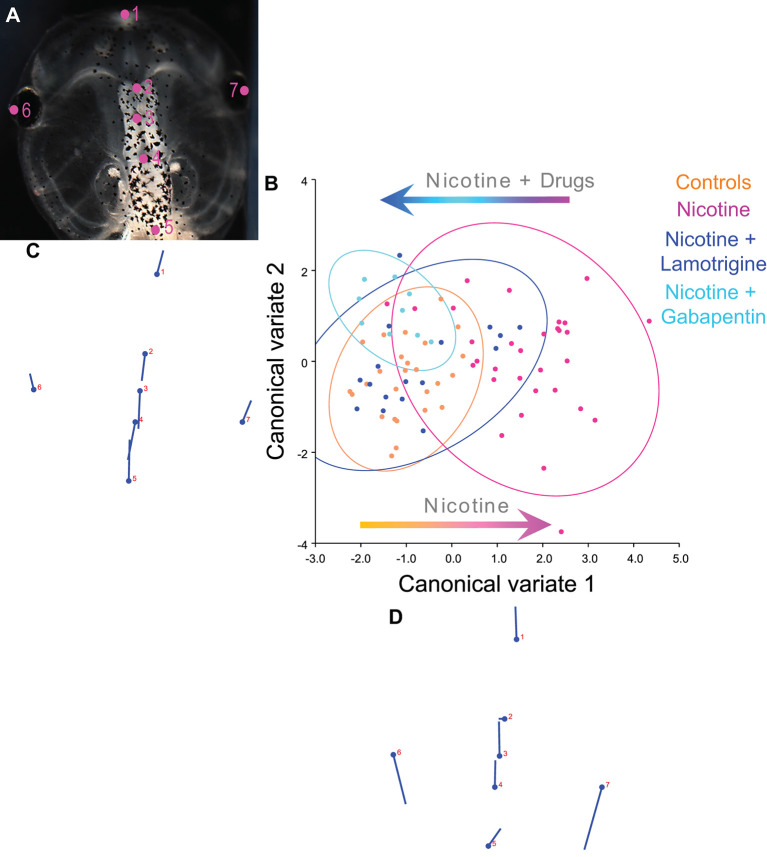 Figure 8. Lamotrigine and Gabapentin restore the brain size relation to anterior head shape in nicotine-exposed embryos. (AâD) Morphometrics canonical variate analysis of brain size in proportion to head shape of stage 45 tadpoles. Representative image of a stage 45 control tadpole (A) illustrating the seven landmarks used in this analysis. (B) Canonical variate analysis, showing confidence ellipses for means at a 0.95 probability of shape data. Confidence ellipses are colored to correspond with treatment as indicated. Lamotrigine and gabapentin treatments were from stage 10â35. N > 10 for each group. Procrustes distances: Control vs. nicotine = 0.12, control vs. nicotine+lamotrigine = 0.04, control vs. nicotine+gabapentin = 0.06. ANOVA of centroid shape between the controls, nicotine+lamotrigine, and nicotine+gabapentin in relation to nicotine treatment confirmed significant differences between the groups (F = 8.2, p < 0.0001). (C,D) Canonical variate axis legend showing the movement of each of the seven landmarks. Each ball represents the landmark as indicated by the number and the accompanying stick represents the direction and extent of movement of that particular landmark. |