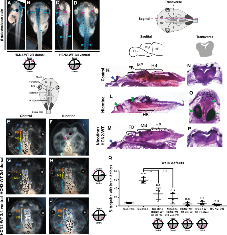 Figure 1. Both local (CNS) and distant (non-CNS) expression of HCN2 channels rescues nicotine-induced brain morphology defects in Xenopus embryos. (AâJ) Representative images of stage 45 tadpoles. (AâD) β-galactosidase expression assessed using X-Gal (blue) in bleached tadpole co-injected with Hcn2-WT and β-galactosidase mRNA. β-galactosidase was observed mainly in the eye, brain, and spinal cord (cyan arrowheads), of dorsal blastomere injections. In ventral blastomere injections, β-galactosidase was absent from the eye, brain, and spinal cord (magenta arrowheads) and was mainly present in the brachial arches, gut, heart, and muscles (cyan arrowheads). (EâJ) Control (untreated and uninjected) or nicotine-treated tadpoles with or without microinjection with Hcn2-WT mRNA either in dorsal or ventral blastomeres at the four-cell stage. Blue arrowheads indicate intact nostrils, orange brackets indicate intact forebrain (FB), yellow brackets indicate intact midbrain (MB), cyan brackets indicate intact hindbrain (HB), intact eyes (e), and magenta arrowheads indicate severe brain morphology defects. (KâP) Histological staining (hematoxylin and eosin) of agarose sections through the brain (sagittal and transverse sections through midbrain) of stage 45 tadpoles. Control (untreated and uninjected) or nicotine-treated tadpoles with or without microinjection with Hcn2-WT mRNA in the ventral blastomeres at the four-cell stage. FB-forebrain, MB-midbrain, HB-hindbrain, blue arrowheads indicate intact nostrils, and green arrowheads indicate severe brain morphology defects. (Q) Quantification of stage 45 tadpole brain morphology defects under indicated conditions. Percentage of tadpoles with brain defects for each experimental group are Controlsâ7%, Nicotineâ59%, Nicotine+HCN2-WT 2/4 dorsalâ27%, Nicotine+HCN2 2/4 ventralâ16%, HCN2 2/4 dorsalâ5%, HCN2 2/4 ventralâ6%, and HCN2-DNâ3%. Data are mean ± SD, ****p < 0.0001, ***p < 0.001, **p < 0.01, n.s.: non-significant (one-way ANOVA with Tukeyâs post hoc test for n = 3 independent experiments with N > 50 embryos per treatment group per experiment). |