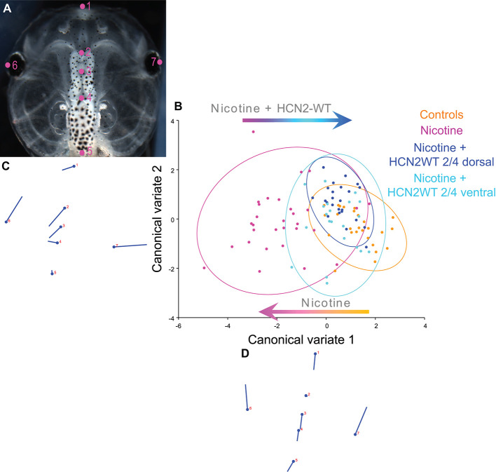 Figure 2. Both local (CNS) and distant (non-CNS) expression of HCN2 channels restore brain size in proportion to head shape in nicotine-exposed embryos. (AâD) Morphometrics canonical variate analysis of brain size in proportion to head shape of stage 45 tadpoles. Representative image of a stage 45 control tadpole (A) illustrating the seven landmarks used in this analysis. (B) Canonical variate analysis, showing confidence ellipses for means at a 0.95 probability of shape data. Confidence ellipses are colored to correspond with treatment as indicated. N > 20 for each group. Procrustes distances: Control vs. nicotine = 0.1, Control vs. nicotine+dorsal-HCN2-WT = 0.04, Control vs. nicotine+ventral-HCN2-WT = 0.05. ANOVA of centroid shape between the controls, nicotine treatment, and nicotine+HCN2-WT (both dorsal and ventral) showed significant differences between the groupings (dorsal microinjectionâF = 10.67, p < 0.0001; ventral microinjectionâF = 9.0, p < 0.0001). (C,D) Canonical variate axis legend showing the movement of each of the seven landmarks. Each ball represents the landmark as indicated by the number and the accompanying stick represents the direction and extent of movement of that particular landmark. |