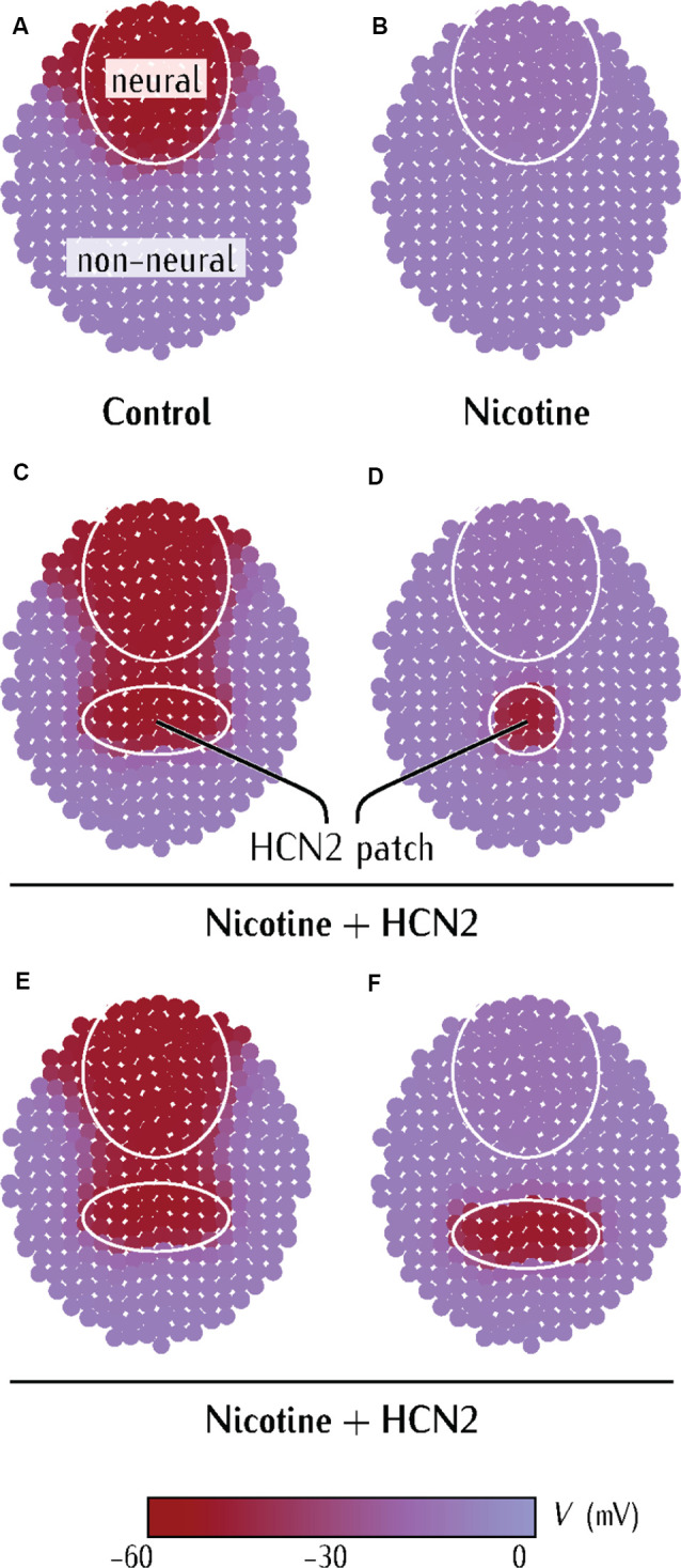 Figure 5. Model predicts limiting conditions for distant (non-CNS) HCN2 channel-mediated rescue of membrane voltage prepattern in nicotine-exposed embryos. (AâF) Simulations from a physiological model of neurulating Xenopus embryo as detailed in Supplementary Figures S1âS3. Maroon color represents the region of polarized membrane voltage. Purple color represents the region of depolarized membrane voltage. The pattern in (A) is analogous to the membrane voltage pattern seen in Xenopus embryos with voltage reporter dyes (Pai et al., 2015b). |