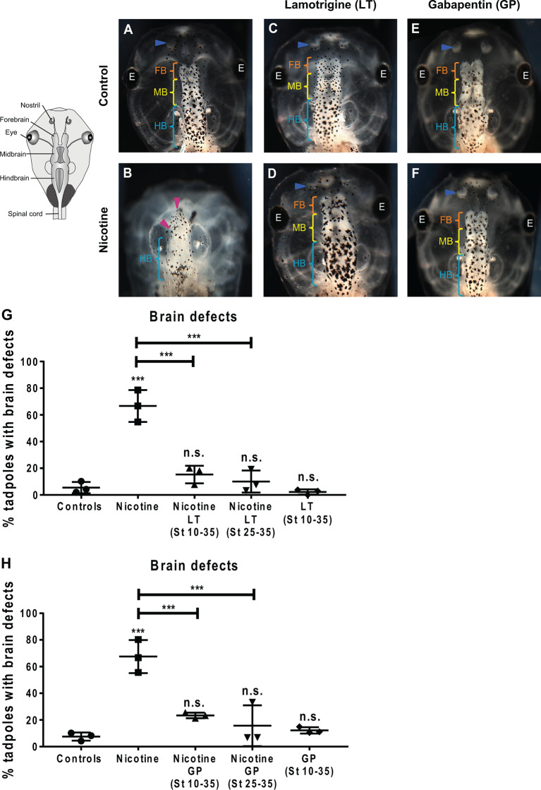 Figure 7. Non-local exposure to Lamotrigine and Gabapentin (HCN channel agonist) rescues nicotine-induced brain morphology defects in Xenopus embryos. (AâF) Representative images of stage 45 tadpoles. Control (untreated and uninjected) or nicotine-treated tadpoles with or without treatment with lamotrigine (LT, stage 10â35) or gabapentin (GP, stage 10â35). Blue arrowheads indicate intact nostrils, orange brackets indicate intact forebrain (FB), yellow brackets indicate intact midbrain (MB), cyan brackets indicate intact hindbrain (HB), and magenta arrowheads indicate severe brain morphology defects. (G,H) Quantification of stage 45 tadpole brain morphology defects under the indicated conditions for lamotrigine (LT; G) or gabapentin (GP; H). Percentage of tadpoles with brain defects for each experimental group are: (G) Controlsâ5%, Nicotineâ67%, Nicotine+LT (St10â35)â15%, Nicotine+LT (St25â35)â10%, and LT(St 10â35)â2%; (H) Controlsâ7%, Nicotineâ68%, Nicotine+GP (St10â35)â23%, Nicotine+GP(St25â35)â16%, and GP(St 10â35)â11%. Data are mean ± SD, ***p < 0.001, n.s.: non-significant (one-way ANOVA with Tukeyâs post hoc test for n = 3 independent experiments with N > 50 embryos per treatment group per experiment). |