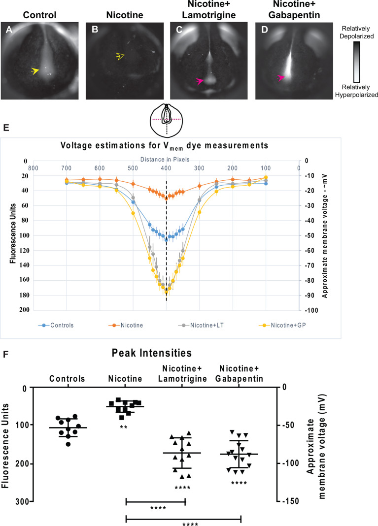 Figure 9. Lamotrigine and Gabapentin restore neural development membrane voltage prepattern in nicotine-exposed embryos. (A–D) Representative CC2-DMPE membrane voltage reporter dye images of stage ~15 Xenopus embryos: Control (untreated and uninjected) and nicotine-treated embryos with or without lamotrigine (stage 10 onwards) or gabapentin (stage 10 onwards) treatment. Solid yellow arrows indicate characteristic hyperpolarization in the neural plate as previously reported (Pai et al., 2015b, 2018). Hollow yellow arrows indicate significantly reduced signal (depolarization) within the neural plate in comparison to controls. Magenta arrows indicate significantly enhanced hyperpolarization in the neural plate compared to controls. (E,F) Quantification of fluorescence from CC2-DMPE images of stage ~15 Xenopus embryos along with electrophysiology-based membrane voltage approximations [as previously reported in references (Pai et al., 2015b, 2018)] for the indicated conditions (LT-lamotrigine, GP-gabapentin). (E) Quantification obtained along the magenta dotted line indicated in the illustration. (F) Quantification at the point of intersection of the magenta and black dotted line indicated in the illustration. Data represented as mean ± SD, **p < 0.01, ****p < 0.0001 (one-way ANOVA with Tukey’s post hoc test for N > 10 embryos for each treatment group at each point of the indicated spatial distance). |