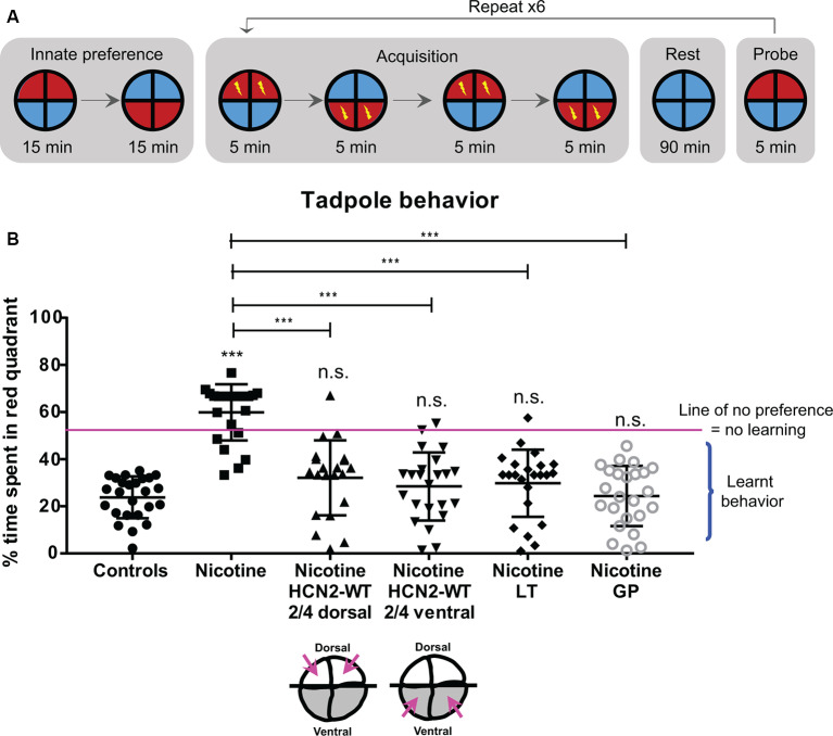 Figure 10. HCN2 channels (local and distant) and HCN2 channel agonists restore associative learning capacity in nicotine-exposed embryos. Associative learning analysis for stage 45â50 tadpoles with indicated treatments. Lamotrigine (LT, stages 10â35) or gabapentin (GP, stages 10â35). (A) The training regime in the behavior analysis machine consisting of an innate preference test, a training phase (acquisition), a rest period, and a learning probe. Automated software executed a training cycle where animals received a shock when occupying the red half of the arena. Training, rest, and testing sessions were repeated a total of six times across the trial. (B) Quantification of time spent by each tadpole in the red-lit area during the final testing probe for each of the indicated treatments. Percentage of time spent by each tadpole in red light for each experimental group are Controlsâ24%, Nicotineâ60%, Nicotine+HCN2-WT 2/4 dorsalâ32%, Nicotine+HCN2-WT 2/4 ventralâ27%, Nicotine+LTâ28%, and Nicotine+GPâ24%. Data represented as mean ± SD, ***p < 0.001, n.s.: non-significant (one-way ANOVA with Tukeyâs post hoc test for N > 20 tadpoles for each treatment group). |