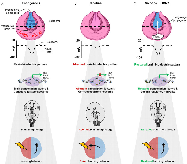 Figure 11. Schematic model of bioelectric signaling in brain teratogenesis and long-range repair. (A) Our new data and those of previous studies (Pai et al., 2015b, 2018) show that the membrane voltage difference between the hyperpolarized neural plate and depolarized surrounding ectoderm is crucial for correct gene expression pattern, proper brain morphology, and normal learning behavior. (B) Embryonic nicotine exposure erases this crucial membrane voltage difference and leads to aberrant gene expression patterns, brain morphology defects, and impaired learning behavior. (C) Transplanting HCN2 channel tissue onto nicotine-exposed embryos is sufficient to restore the membrane voltage difference over long-range and rescue gene expression patterns, brain morphology defects and learning behavior in these animals. |