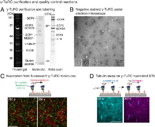 Figure 1—figure supplement 1. Controls for γ-TuRC-mediated microtubule nucleation.(A) Protein gel of purified γ-TuRC was stained with SYPRO Ruby stain (left). Biotinylated sites on γ-TuRC was visualized with alkaline phosphatase conjugated to avidin (middle), and Alexa-568-labeled subunits of γ-TuRC after additional fluorescent conjugation were visualized on an SDS-PAGE with Typhoon 9500 fluorescence imager (right). Major, known γ-TuRC components were detected in the purified protein and GCP2/3 are heavily biotinylated or Alexa-568 labeled during purification. The experiments were repeated thrice with independent γ-TuRC preparations, with the exception of Alexa-568 scan that was repeated twice. (B) Purified and biotinylated γ-TuRC was stained with uranyl acetate and visualized with transmission electron microscopy. Scale bar, 100 nm. The experiments were repeated over ten times with independent γ-TuRC preparations. (C) Fluorescentlylabeled and biotinylated γ-TuRC molecules (pseudo-colored as green) were attached, incubated with 10.5 μM αβ-tubulin (pseudo-colored as red) and time-lapse of MT nucleation after is shown. γ-TuRCs denoted with yellow arrows have nucleated a MTs before 180 s, while those labeled with gray arrows nucleated MTs between 180 and 330 s visualized in the time-lapse. Scale bar, 10 μm. See Video 2. The experiment was repeated six times with three independent γ-TuRC preparations. (D) MTs were first nucleated from γ-TuRC with Alexa 568-labeled tubulin (pseudo-colored in cyan), followed by introduction of Cy5-labeled tubulin (pseudo-colored in magenta). New tubulin incorporates only on the freely growing, plus-end but not at the nucleated minus-end. Scale bar, 10 μm. The experiment was performed three times with two independent γ-TuRC preparations. See also Figures 1–2 and Videos 1–2. |
