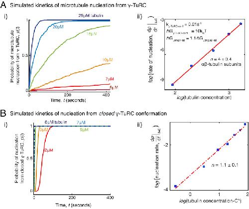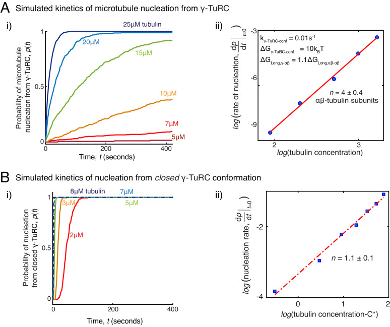 Figure 5âfigure supplement 2. Simulations of microtubule nucleation from γ-TuRC and from blunt seeds.(A) Simulations recapitulated experimental data for γ-TuRC-mediated MT nucleation. Parameter values used: kon=1.3Ã106 (Mâ1sâ1pfâ1), ÎGLong,αβâαβ=â7.2kBT, ÎGLat,αβâαβ=â6.5kBT, ÎGLong,γâαβ=1.1ÎGLong,αβâαβ, kγTuRC-conf=0.01s-1 and ÎGγTuRCâconf=10kBT. 500 simulations each were performed for a range of tubulin concentration 5 to25 μM. Probability of MT nucleation (p(t)) versus time (t) is displayed in (i). The initial rate of nucleation dpdt|tâ0 was measured at each tubulin concentration and plotted against concentration on a log-log axis in (ii). Linear curve was fit for n=5 simulated data points, and critical nucleus of 4 ± 0.4 αβ-tubulins. See Figure 2C-D for comparison with experimental results. (B) MT nucleation dynamics from a closed γ-TuRC were simulated to compare with experimental data for blunt-seed-mediated MT assembly. Parameter values used: kon=1.3Ã106 (Mâ1sâ1pfâ1), ÎGLong,αβâαβ=â7.2kBT, ÎGLat,αβâαβ=â6.5kBT, ÎGLong,γâαβ=1.0ÎGLong,αβâαβ. An input for kγTuRC-conf or ÎGγTuRCâconf were not required because γ-TuRC does not undergo an open-to-closed transition. 200 simulations each were performed for a range of tubulin concentration 2-8 μM. For each simulation, time point where over 50nm length of MT has assembled was recorded. Probability of MT nucleation (p(t)) versus time (t) is displayed in (i). The initial rate of nucleation dpdt|tâ0 was measured at each tubulin concentration and plotted against concentration, C-C* on a log-log axis in (ii). Critical concentration of polymerization, C*=1.4 μM. Linear curve was fit for n=7 simulated data points, and critical nucleus of 1.1 ± 1 αβ-tubulins. See Figure 3D-E for comparison with experimental results. See also Figure 5. |