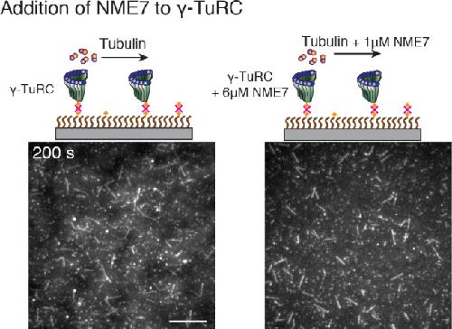 Figure 6—figure supplement 1. Effect of putative activation factor NME7 on γ-TuRC-mediated nucleation.(A) A constant density of γ-TuRC molecules were attached without (left) and with (right) 6 μM NME7 and 10.5 μM tubulin ±1 μM additional NME7 was added. Experiments were repeated twice on different experimental days with the same γ-TuRC preparation. See also Figure 6 and Video 6. |