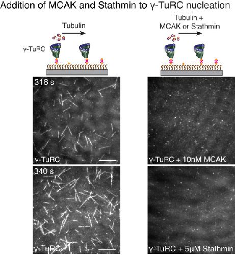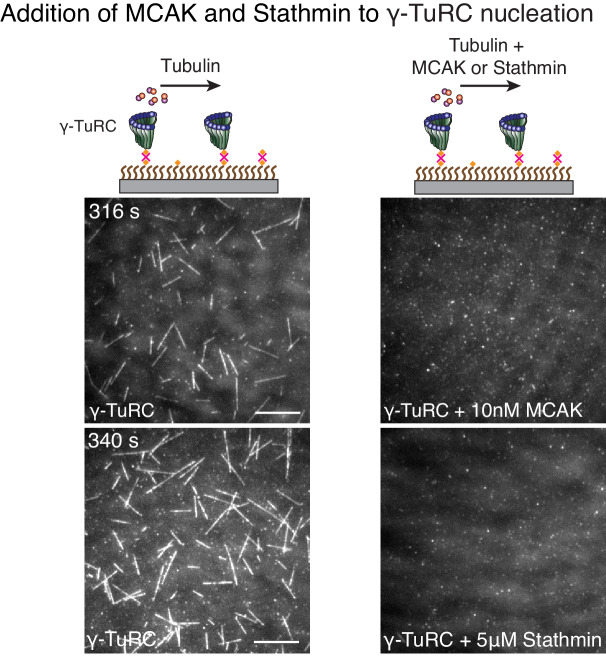 Figure 7âfigure supplement 2. MCAK and Stathmin inhibit γ-TuRC-mediated nucleation.(A) γ-TuRC molecules were attached to coverslips and either 10.5 μM tubulin alone (left panels), 10 μM tubulin + 10 nM MCAK (top-right) or 10 μM tubulin + 5 μM Stathmin (bottom-right) was added to the reaction. Both MCAK and Stathmin were observed to decrease the number of MTs nucleated. For MCAK, the experiment and control were repeated three times with independent γ-TuRC preparations. For Stathmin, the experiment and control were repeated identically two times with independent γ-TuRC preparations and an additional, supporting experiment was performed at a slightly different concentration (7 μM tubulin ± 2 μM Stathmin). See also Figure 7 and Video 9. |