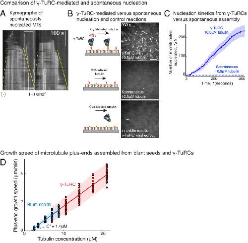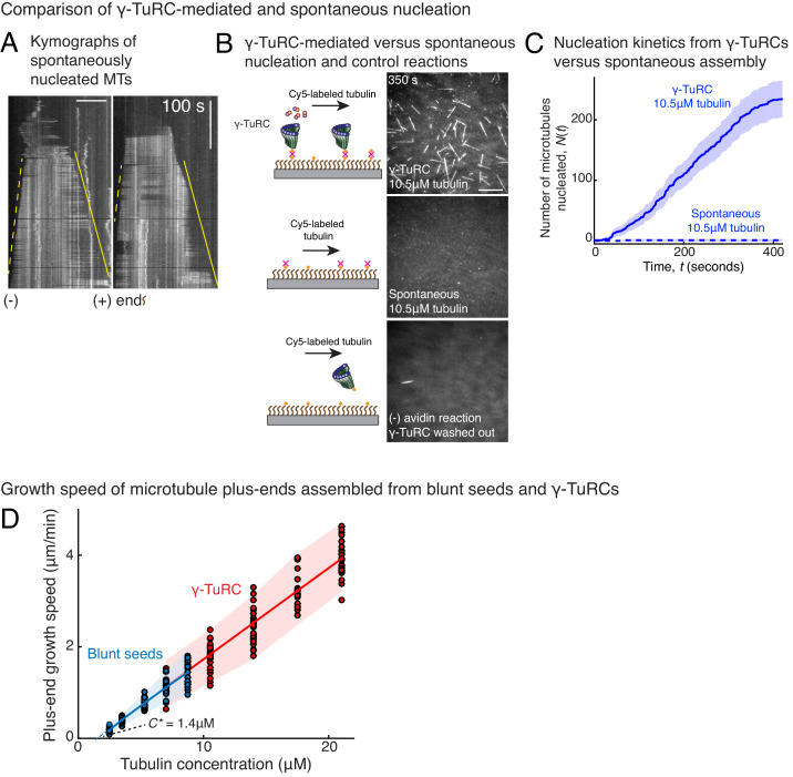 Figure 3—figure supplement 1. Controls for spontaneous and blunt seed-mediated microtubule nucleation.(A) Representative kymographs of spontaneously nucleated MT is displayed, demonstrating that MTs grow from both the minus-end (dotted line) and the plus-end (solid line) and can be distinguished from γ-TuRC-mediated nucleation. Scale bar, 10 μm. Tens of kymographs were generated from at least three independent experiments. (B) Comparison of γ-TuRC-mediated with spontaneous MT nucleation and reactions where γ-TuRC was not attached. MTs were nucleated by attaching purified γ-TuRC (left), adding control buffer to allow for spontaneous MT nucleation (middle) or leaving avidin out to test the level of nucleation by non-specifically attached γ-TuRCs (right). Robust MT nucleation only occurs with γ-TuRC attached to coverslips and not in control reactions. Scale bar, 10 μm. (C) MTs nucleation from γ-TuRCs or spontaneously were compared directly at 10.5 μM tubulin concentrations. Shaded regions represent 95% confidence interval (n±2n) in the number of nucleated MTs (n) assuming a Poisson distribution as described in Materials and methods. γ-TuRC nucleates significantly higher number of MTs than spontaneous assembly. The experimental set and analyses in (B–C) were repeated identically two times with independent γ-TuRC preparations. (D) MTs were assembled from blunt seeds. Tubulin concentration was titrated, and growth speed of MT plus-ends was measured from kymographs (blue circles). Critical concentration (C* = 1.4 μM) was determined from the linear fit (blue line) with shaded 95% confidence intervals. The experiment and analyses in were repeated thrice with independent seed preparations. The growth speed of MTs assembled from seeds was overlaid with those nucleated from γ-TuRC (Figure 2B, red circles and line) for comparison. See also Videos 3, 4, 5 and Figures 2, 3. |
