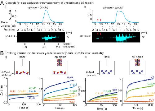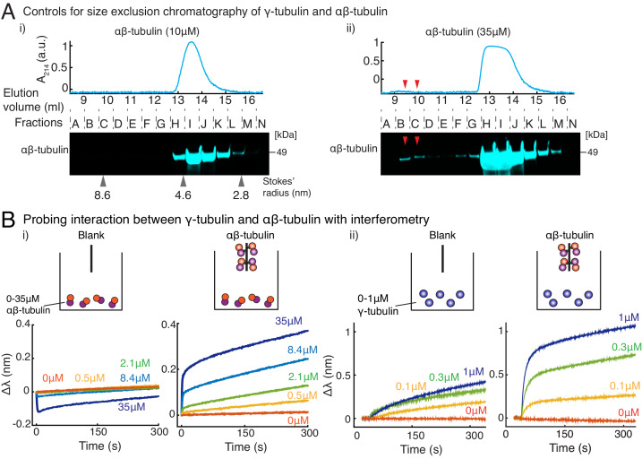 Figure 4—figure supplement 1. Purified γ-tubulin binds αβ-tubulin with high affinity in vitro.(A) Size-exclusion chromatography was performed with 35μM and 10μM αβ-tubulin alone in (i) and (ii), respectively. Gel filtration fractions were analyzed via SDS–PAGE followed by immunoblot with αβ-tubulin antibodies. At high concentration (35μM), αβ/αβ-tubulin self-interaction occurs, and oligomeric species elutes in fractions B-C, as seen via the immunoblot and absorbance reading. Oligomeric species is not observed at 10 μM αβ-tubulin. Stokes’ radii of reference proteins: thyroglobulin (8.6 nm), aldolase (4.6 nm) and ovalbumin (2.8 nm), are marked at their elution peak. Size exclusion runs was repeated three times for 35 μM αβ-tubulin and twice for 10 μM αβ-tubulin. (B) Molecular interaction between γ/αβ-tubulin was verified with bio-layer interferometry. Buffer ((i) and (ii), left curves) or biotin-tagged αβ-tubulin ((i) and (ii), right curves) was loaded on the probe as bait. Untagged αβ-tubulin (i) at 0-35 μM or γ-tubulin (ii) at 0-1 μM were used as prey. Wavelength shift, Δλ (nm) was recorded to estimate the mass of bound protein on the probe. More than 2 μM of αβ-tubulin was needed to observe significant binding to biotin-αβ-tubulin. While γ-tubulin non-specifically associates with the probe to a low extent, significant association with biotin-αβ-tubulin over this non-specific binding was observed at significantly lower concentrations (300 nM). The experiments in (i) and (ii) were repeated two times independently. See also Figure 4. |