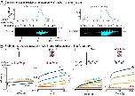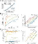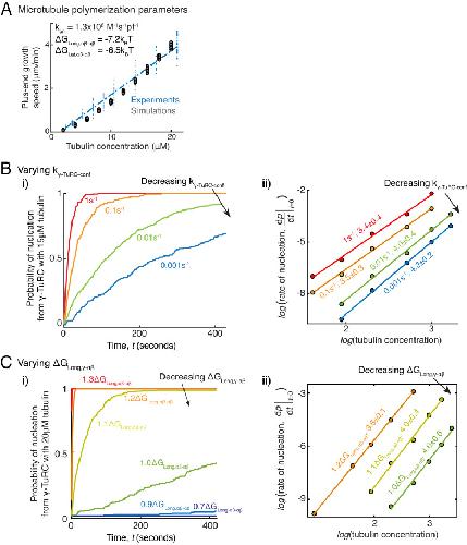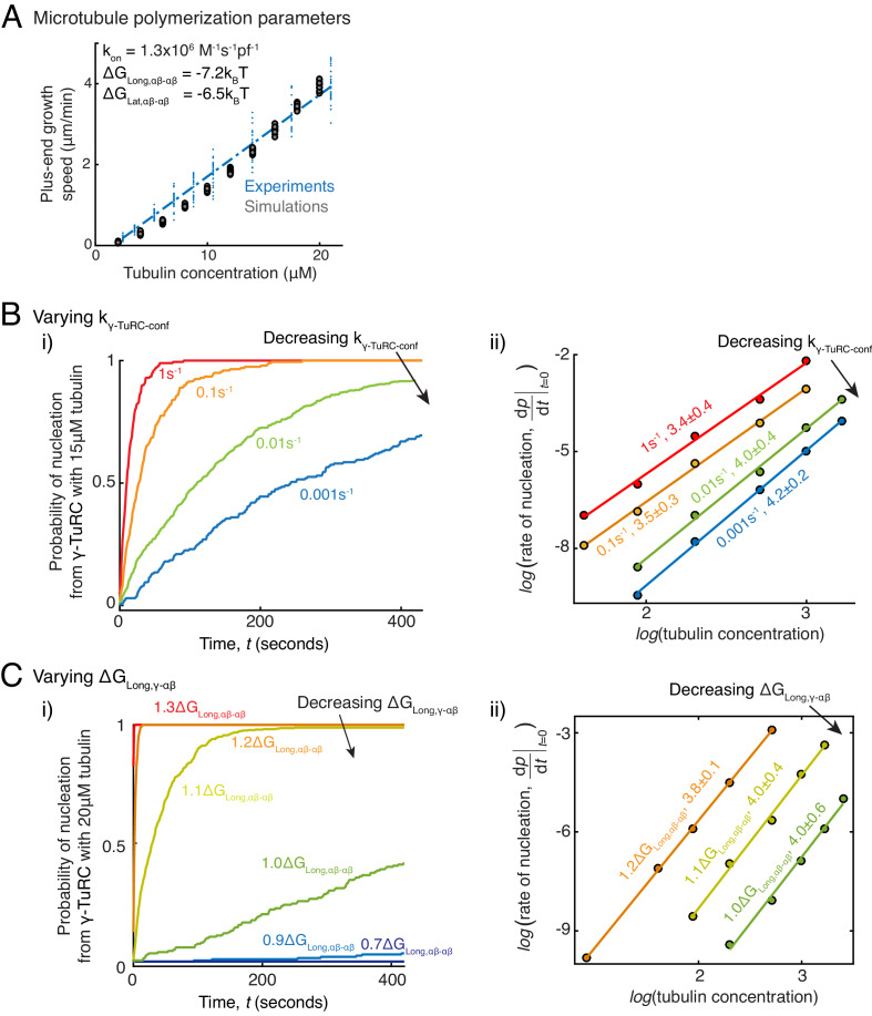 Figure 5—figure supplement 1. Parameter variation in Monte Carlo simulations of γ-TuRC-mediated nucleation.(A) MT plus-end assembly was simulated. Parameter values used: kon=1.3×106 (M−1s−1pf−1)ΔGLong,αβ−αβ=−7.2kBT, ΔGLat,αβ−αβ=−6.5kBT. 20 simulations each were performed at tubulin concentration 2-20 μM. MT growth speed was obtained from each MT length versus time trace and overlaid on experimental data. (B) MT nucleation from γ-TuRC was simulated with input polymerization parameters defined above, ΔGγTuRC−conf=10kBT and ΔGLong,γ−αβ=1.1ΔGLong,αβ−αβ. kγTuRC-conf was varied from (1-0.001)s-1. Tubulin concentration was varied from 5 to30μM. 200 simulations were performed for a given tubulin concentration at every kγTuRC-conf value, except for kγTuRC-conf=0.01s-1 where 500 simulations were performed. Probability of MT nucleation (p(t)) versus time (t) curves at 15 μM tubulin are displayed in (i). The initial rate of nucleation dpdt|t→0 was measured and plotted against concentration on a log-log axis in (ii). The critical nucleus size does not change significantly while the absolute rate of nucleation decreases with decreasing kγTuRC-conf. (C) MT nucleation from γ-TuRC was simulated with input polymerization parameters defined above, ΔGγTuRC−conf=10kBT and kγTuRC-conf=0.01s-1. ΔGLong,γ−αβ was varied from (0.7−1.3)×ΔGLong,αβ−αβ. 200 simulations were performed for every ∆GLong,γ-αβ value at tubulin concentrations between 2.5 and 30 μM, except for ΔGLong,γ−αβ=1.1ΔGLong,αβ−αβ where 500 simulations were performed. Probability of MT nucleation (p(t)) versus time (t) curves at 20 μM tubulin are displayed in (i). The initial rate of nucleation dpdt|t→0 was measured and plotted against concentration on a log-log axis in (ii). For 0.7,0.9,1.3∆GLong,αβ-αβ, either few MTs nucleate or nucleation occurs immediately, and critical nucleus size could not be accurately measured. See also Figure 5. |
