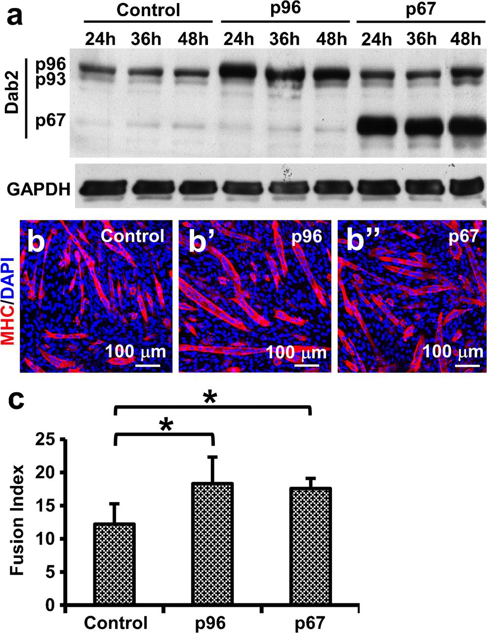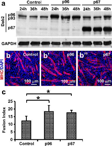 Fig. 3 Dab2 overexpression led to enhanced myogenic differentiation. C2C12 cells were transfected with the Dab2 expression plasmids (p96 or p67 isoform) or the control plasmid. (a) Western blot showing the expression of Dab2 proteins at 24, 36, and 48 h post-transfection. (b) Representative photomicrographs showing immunoreactivity of MHC in myotubes 5 days after the induction of myogenic differentiation. C2C12 cells were induced to differentiate on day 3 post-transfection when cells were about 80% confluent. (c) Bar chart showing myogenic fusion indices. *pâ<â0.05 (nââ¥â4), significantly different from the control value, Studentâs t test. Data are expressed as mean ± SD