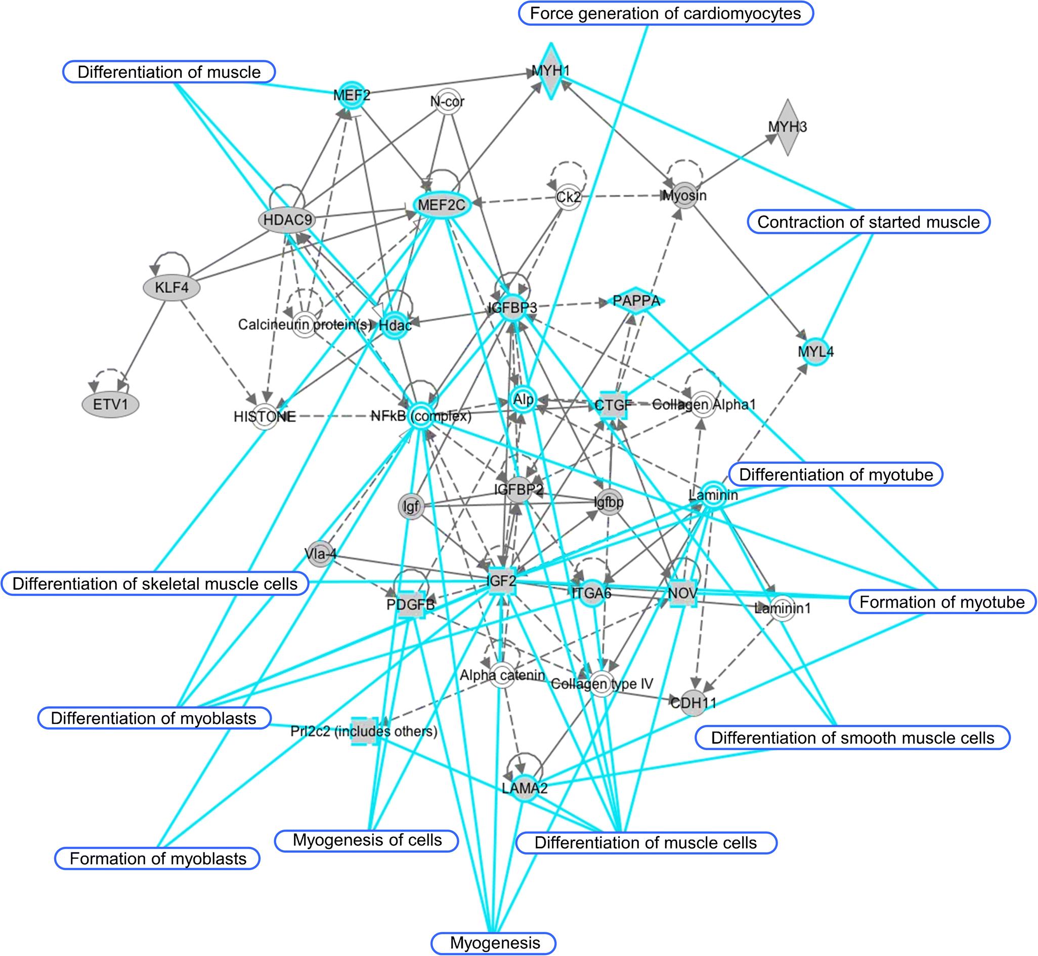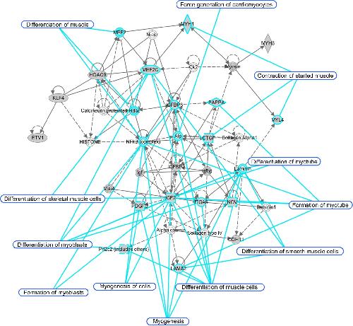 Fig. 6 Network analysis of differentially expressed genes in clone 5-2 as compared to control C2C12 myoblasts. Genes whose expression was significantly upregulated or downregulated by 2-folds or more were analyzed by the Ingenuity Pathway Analysis (IPA) software. Representative network that emphasizes the role of Dab2 in modulating the muscular system is shown. Genes highlighted in gray are identified by microarrays as differentially expressed genes in clone 5-2 with Dab2 knockdown as compared to control C2C12 myoblasts which were transfected with nontargeting shRNAs
