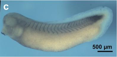 myf5 (myogenic factor 5) gene expression in a Xenopus laevis embryo, NF stage 31/32, assayed via in situ hybridization, lateral view , anterior left, dorsal up.
