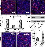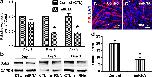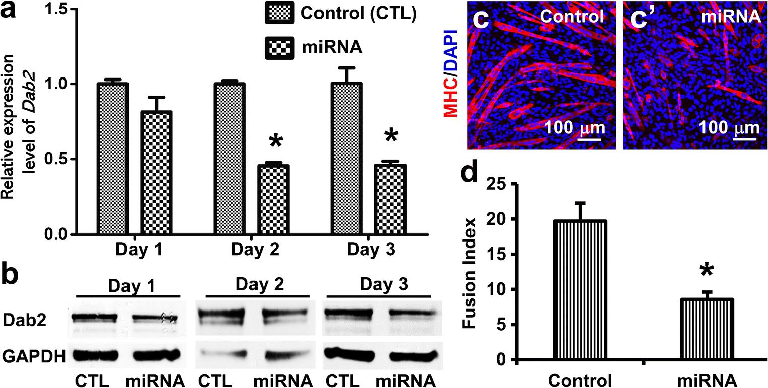 Fig. 2 Knockdown of Dab2 led to decreased myogenic differentiation. (a, b) C2C12 cells were transfected with control or Dab2 miRNA plasmids, and cells harvested on days 1, 2, and 3 after transfection were further processed for (a) qPCR (nâ=â3) and (b) western blot (nâ=â3). Anti-Dab2 antibodies are able to recognize all three isoforms. *pâ<â0.01, Studentâs t test. (c) On day 3 post-transfection when cells reached about 80% confluence, they were induced to differentiate with the differentiation medium containing 2% NHS for 5 more days. Then the cultures were immunofluorescently stained with an antibody against MHC, a marker of myotubes, and cell nuclei were stained with DAPI. Three independent experiments were performed, and similar outcomes were obtained. Representative photomicrographs are shown. (d) Bar chart showing myogenic fusion indices of the control and miRNA groups. The myogenic fusion indices were calculated as described under the âMaterials and methods.â *pâ<â0.01 (nââ¥â4), Studentâs t test. Data are expressed as mean ± SD
