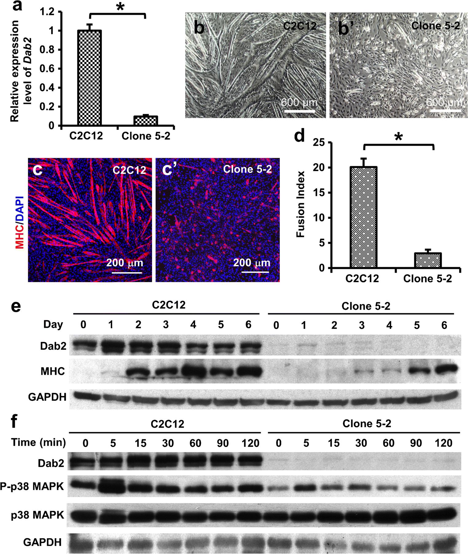 Fig. 4 Dab2 stable knockdown reduced myogenic differentiation and phospho-p38 MAPK. C2C12 cells were infected with lentiviruses carrying Dab2 shRNA at MOI of 5. Clone 5-2 stably expressing Dab2 shRNA was established in the culture medium containing 2 μg/ml puromycin. (a) qPCR results showing 90.3% Dab2 knockdown efficiency in clone 5-2 as compared with C2C12 cells in the control group which were infected with nontargeting shRNAs. (b) On day 3 post-infection, control C2C12 cells and clone 5-2 with about 80% confluence were induced to differentiate into myotubes in the differentiation medium containing 2% NHS for 5 days. Representative phase-contrast images are shown. (c) Representative photomicrographs showing myotubes expressing MHC. (d) Bar chart showing myogenic fusion indices. *pâ<â0.01, nâ=â4, Studentâs t test. Data are expressed as mean ± SD. (e) Western blot showing expression of Dab2 (p96) and MHC proteins on days 0 to 6 after the induction of differentiation. (f) Western blot showing expression of Dab2 (p96), phospho-p38 MAPK, and p38 MAPK at different time points after the FGF treatment. GAPDH is the loading control